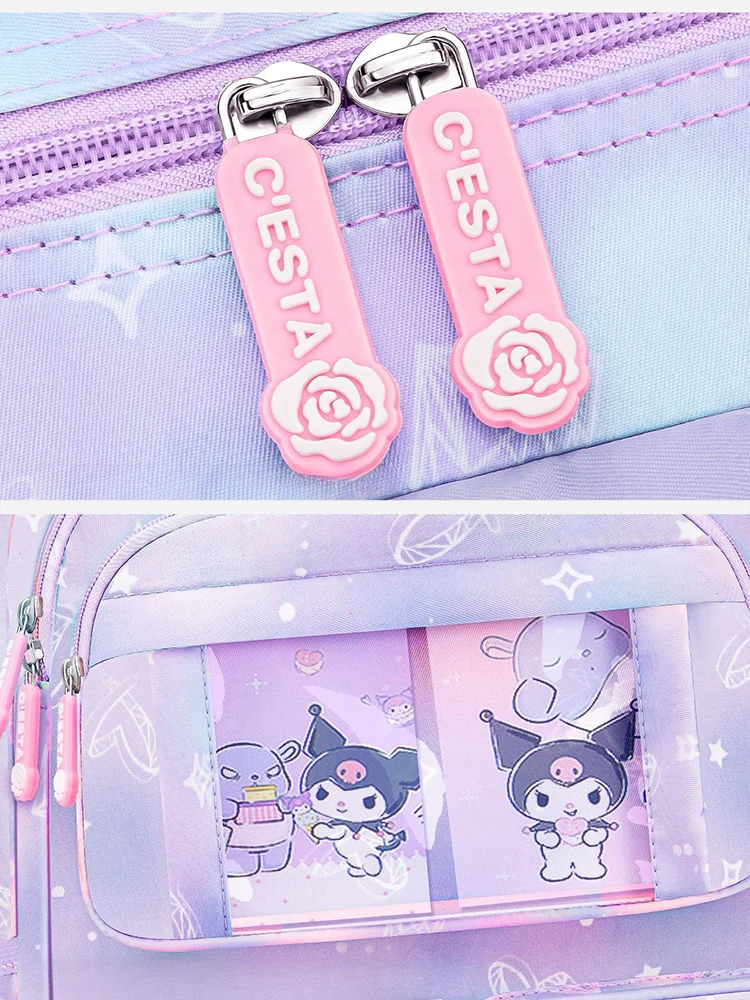 The MINISO Sanrio Kuromi Student Backpack is a delightful fusion of charm and practicality. Designed for young students, this kawaii backpack features the beloved Sanrio character Kuromi, bringing both style and comfort to school. Perfect for girls who adore cute cartoon characters, this backpack is not only fashionable but also thoughtfully designed to protect growing spines and reduce carrying burdens.