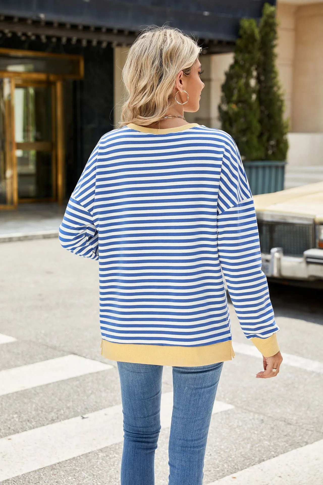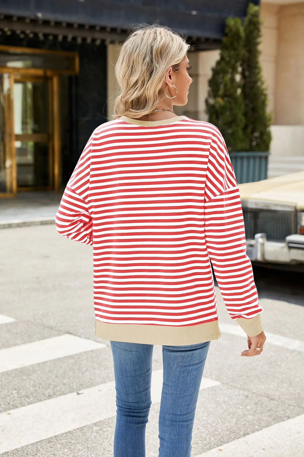 Versatility This striped pullover top is incredibly versatile, making it easy to style for various occasions. Pair it with jeans or leggings for a laid-back, casual look, or dress it up with a skirt and boots for a more polished ensemble. The mix of colors and the split design make this top a standout piece that can be worn for both casual outings and more relaxed social events.