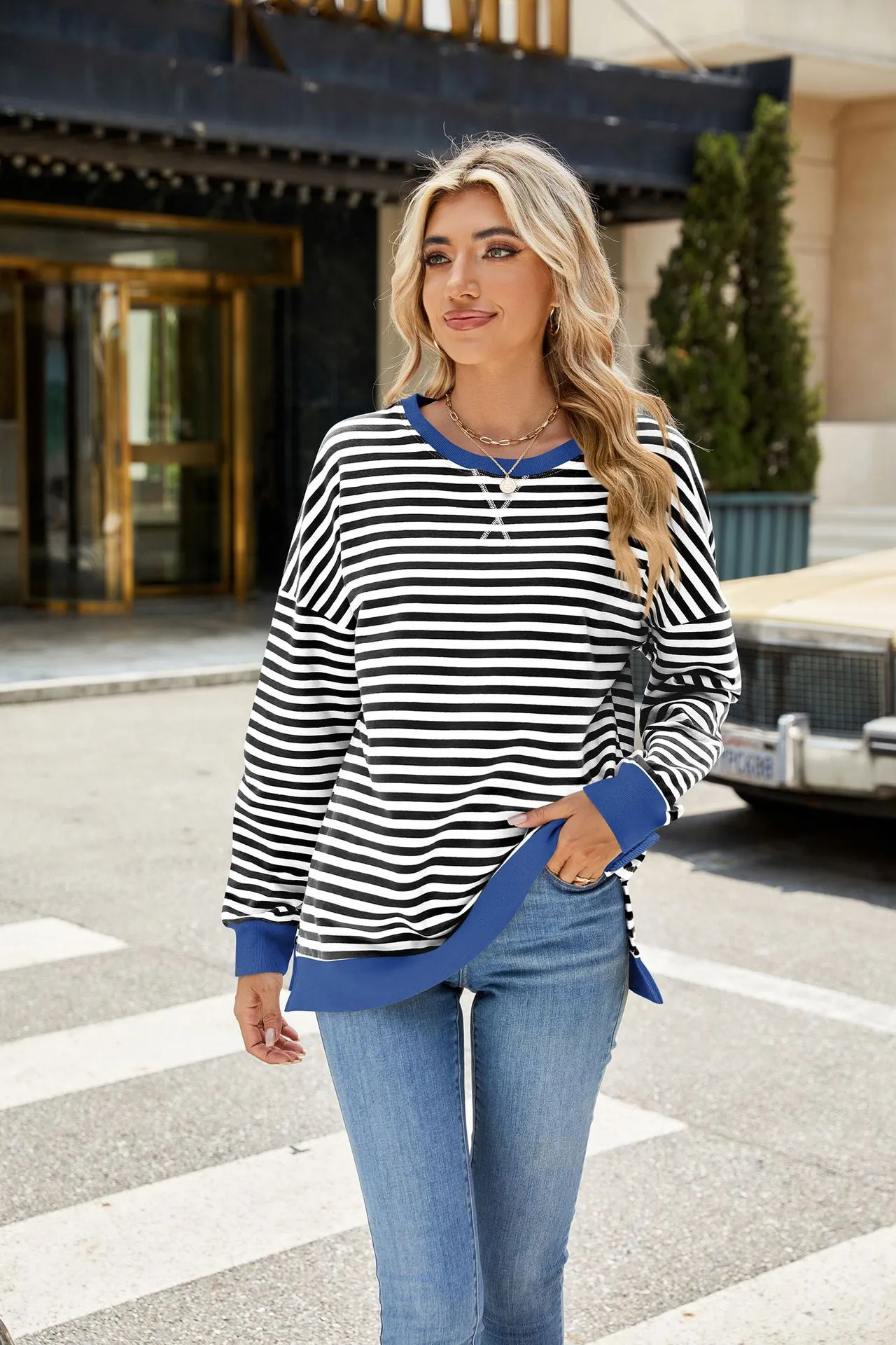 Mixed Color Striped Printed Split Design Long Sleeve T-Shirt Women's Clothing