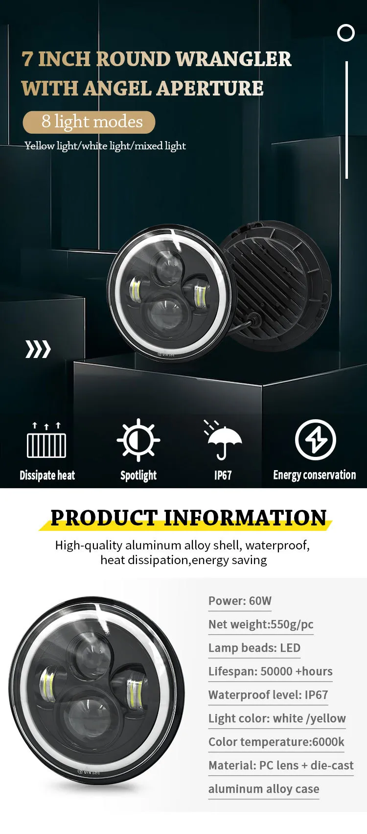 The 7-inch LED work light operates using high-intensity LEDs that produce 50W of powerful, energy-efficient illumination. The main LED light emits bright white light for excellent road visibility, while the RGB Angel Eye halo allows for customizable color settings, controlled via a wireless remote or mobile app (depending on the model).