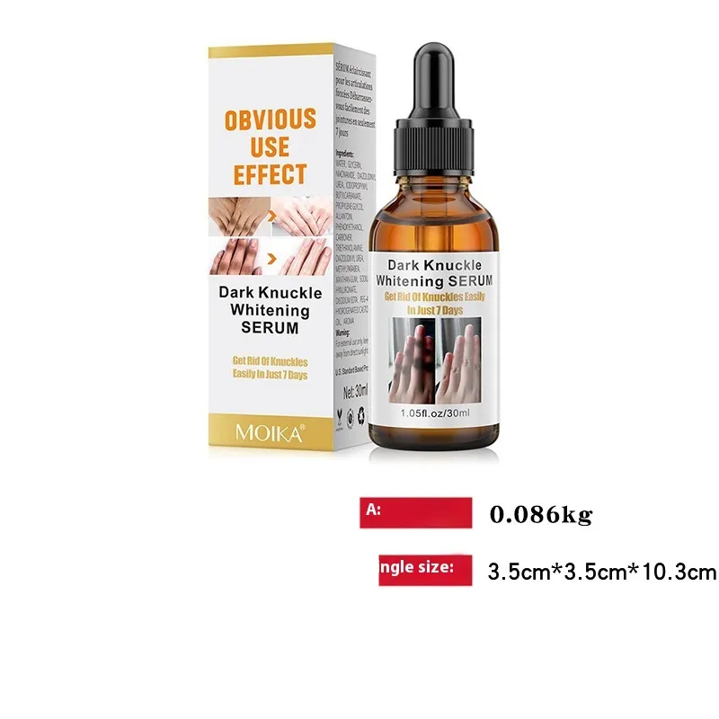 The Moika Joint Blackening Knee Ankle Brightening Skin Color Fading Spots Liquid is formulated to brighten and even out skin tone, specifically targeting dark spots, hyperpigmentation, and discoloration around the knees, ankles, and joints. The formula is designed to lighten the skin gradually, helping to restore its natural radiance and reduce the appearance of dark patches caused by friction, sun exposure, or other environmental factors.