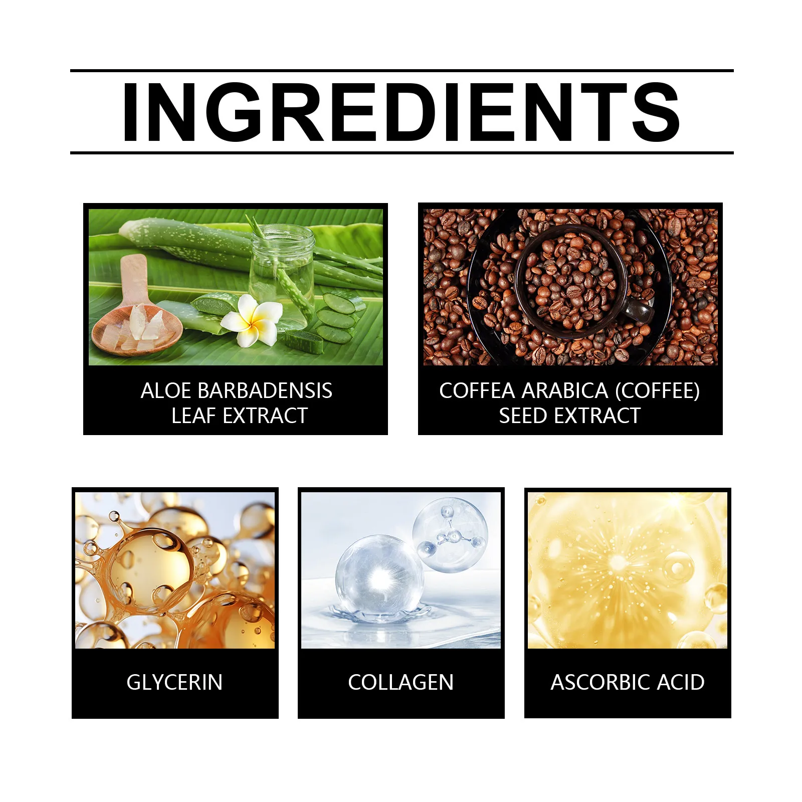 Ingredients: aloe leaf extract, ascorbic acid (vitamin C) glycerin, coffee seed extract, collagen