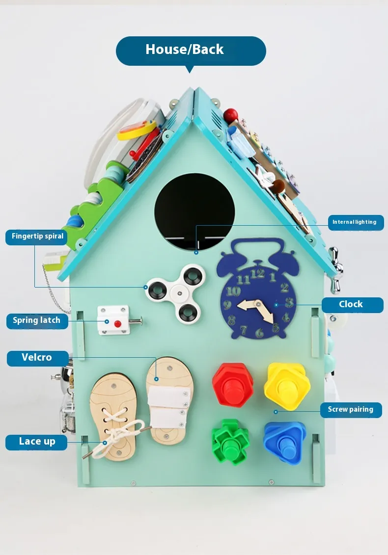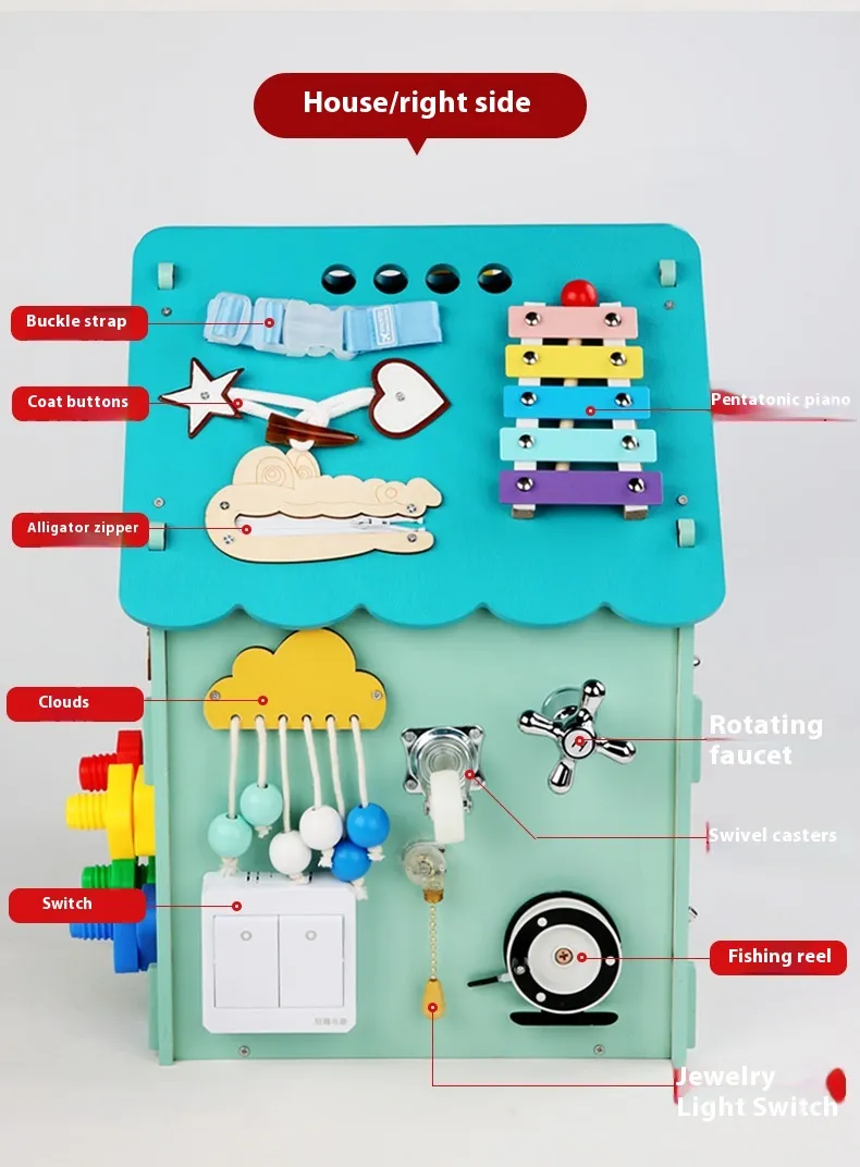 Multifunctional Busy Box Design: The busy house box features various activities such as buttons, latches, locks, and other