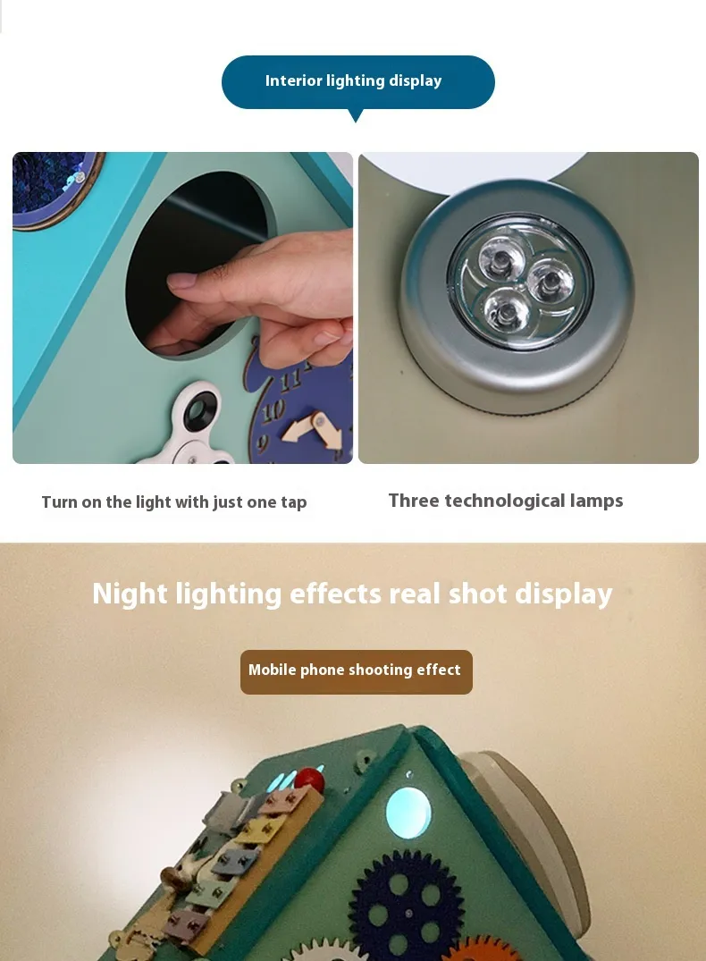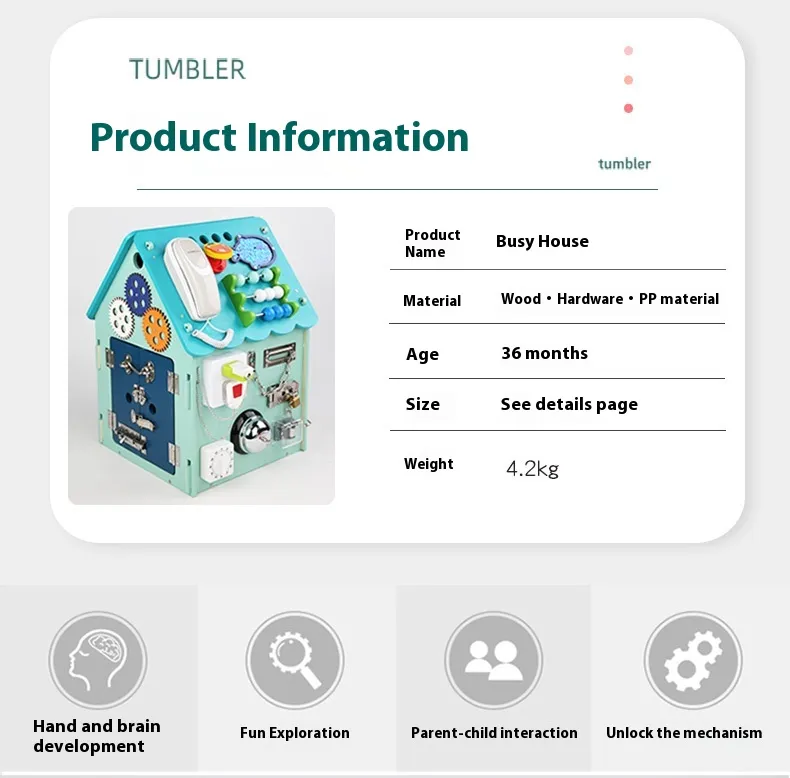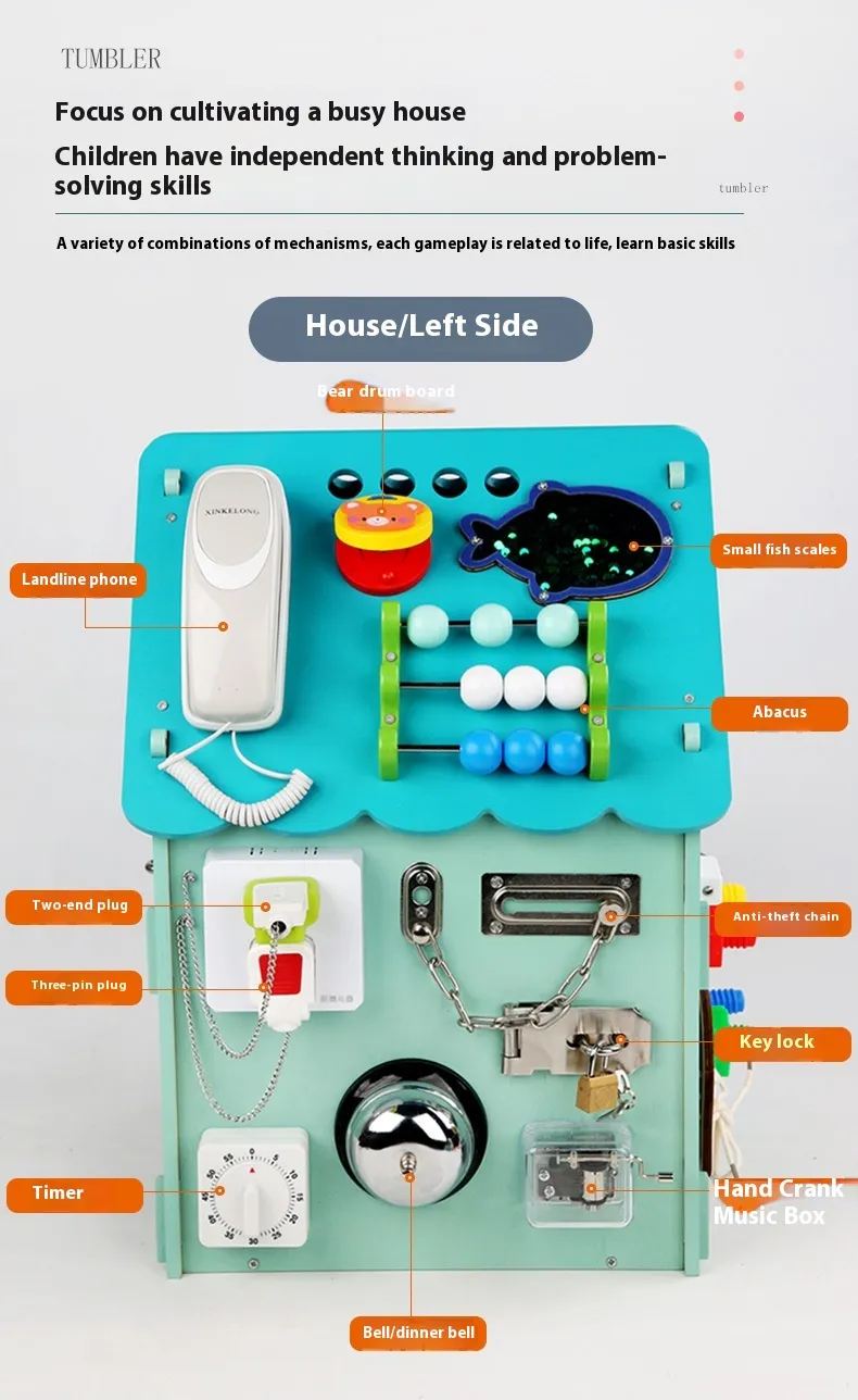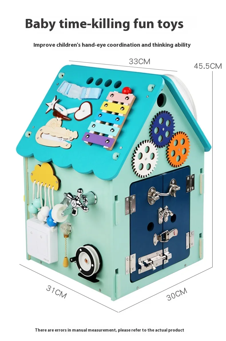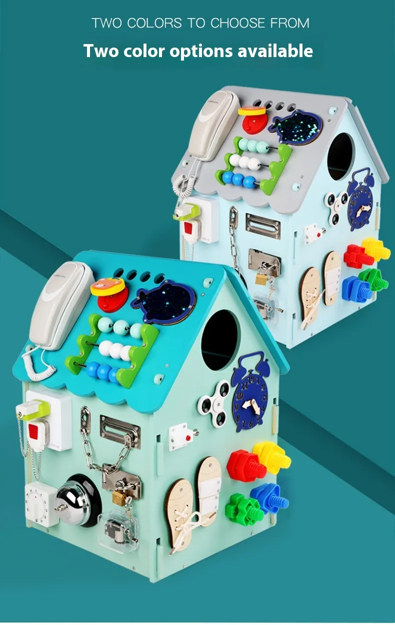 Multifunctional Busy Box Design: The busy house box features various activities such as buttons, latches, locks, and other