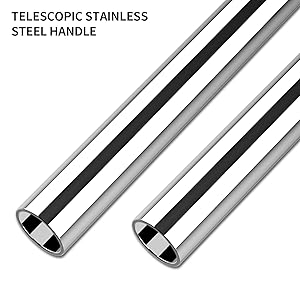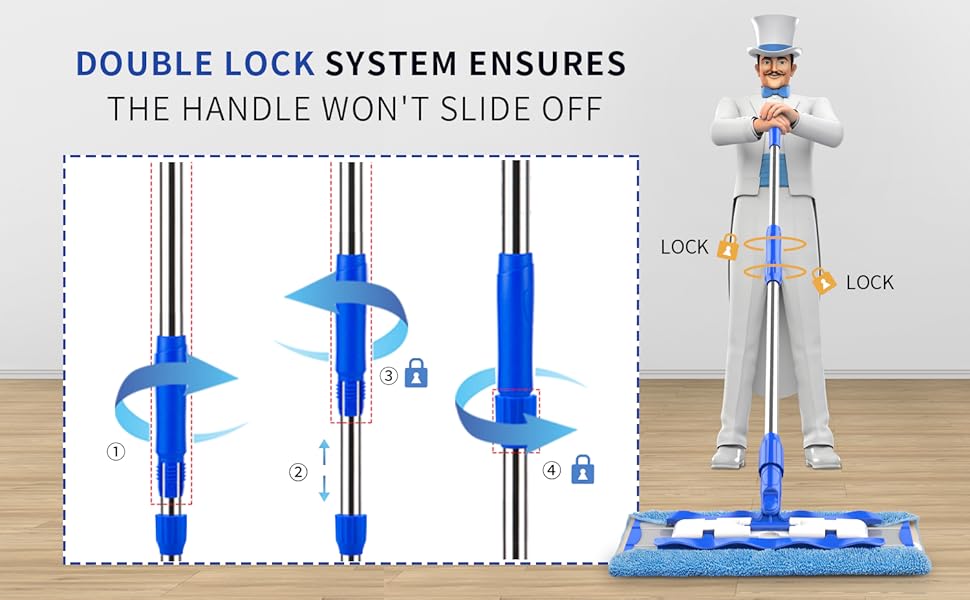 - DOUBLE LOCK TELESCOPIC SYSTEM - Stainless steel adjustable handle can be extended and locked to any available position, which offers a comfortable pickup and hold for different person, makes cleaning the floor without having to bend down. Heavy duty stainless steel handle with double lock system is designed to hold the desired position firmly in its place, so you don't have to worry the pole will slide down while mopping