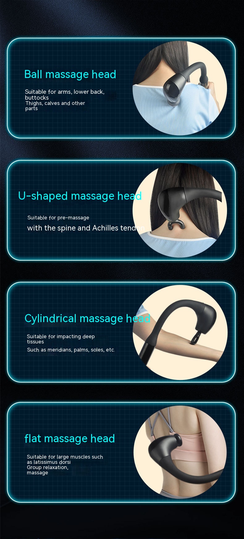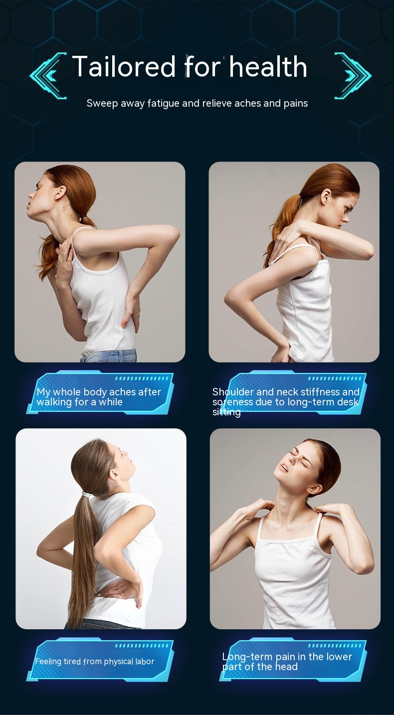 The massage gun is suitable for people :those who work at the computer for a long time; those whomaintain the same posture for a long time; those who arenervous and have insomnia and dreaminess; those whohave stiff neck and shoulders, muscle fatigue; those whohave neck and shoulder pain, numbness and weakness inhands; those who have insufficient brain supply and haveheadaches Faint person.