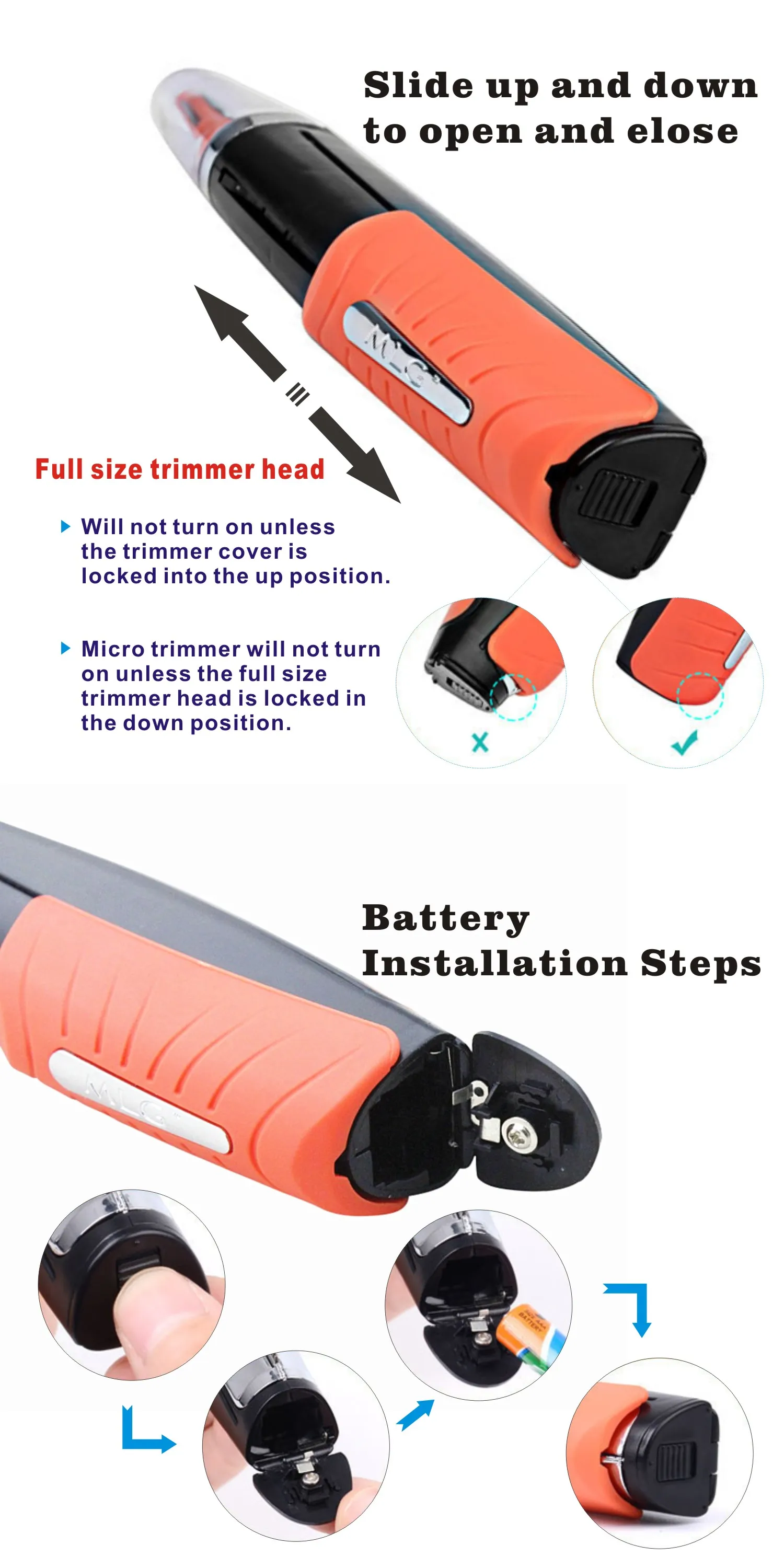 Note:Keep out of reach of children.It is not waterproof.The micro trimmer will not turn on unless the full-size trimmer