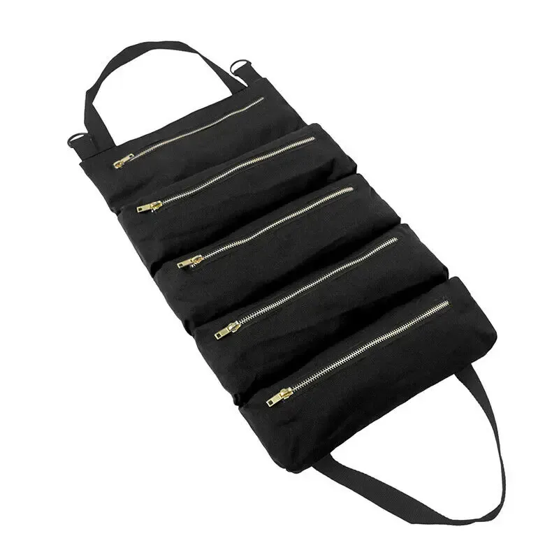 *Extremely durable material of waterproof canvas fabric,strong fixing strap in the middle, 5 zippered pockets for different types tool accessories