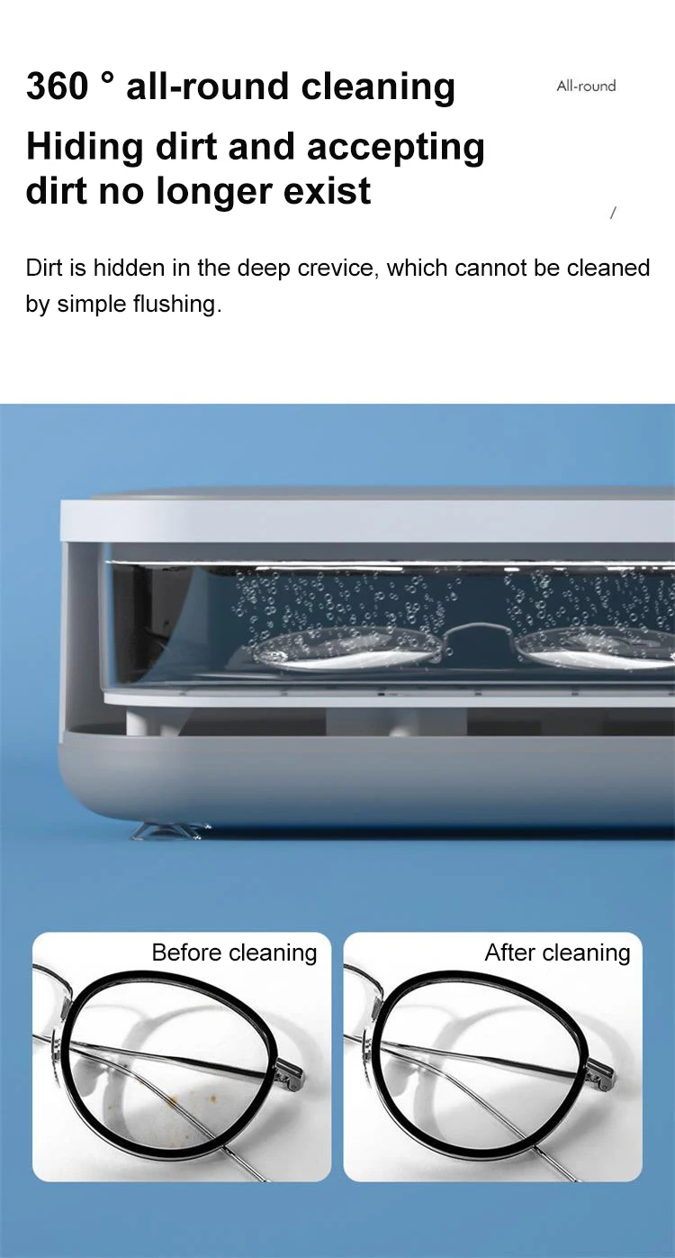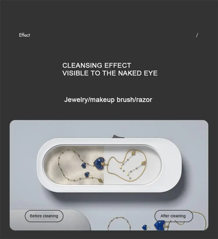 2.The cleaner can be used to clean jewelry, rings, glasses, false teeth, coins, makeup brushes, eggs, watches, necklaces, razors, tableware, dental braces, daily necessities, etc.