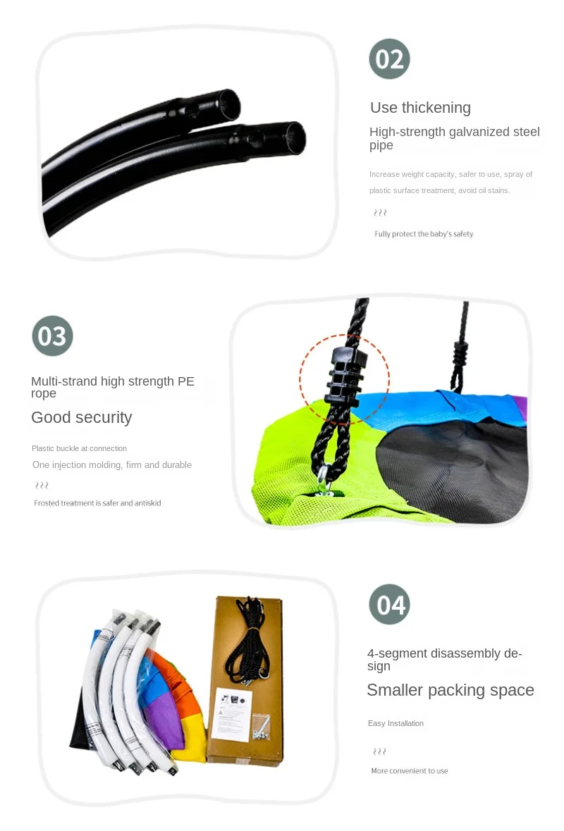 Safety is a top priority, and this swing features reinforced stitching and a solid structure to ensure a secure and stable ride. The large, wide base helps to keep the swing stable, preventing tipping or tilting, while the rope system is designed to distribute weight evenly for a smooth, gentle swing. It provides a safe environment for your child to relax, play, and enjoy the outdoors.