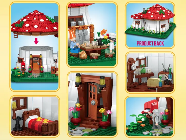 - Follow the step-by-step instruction manual to build the mushroom house and surrounding scene.