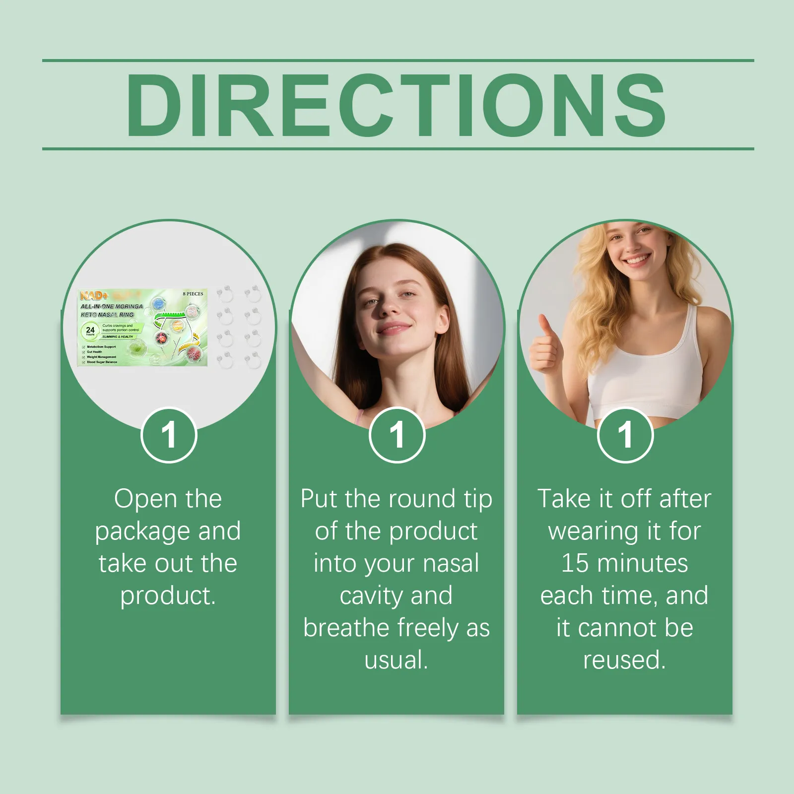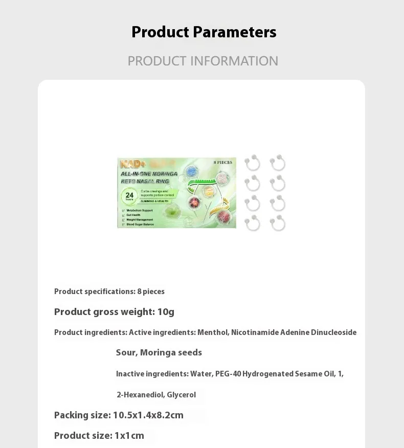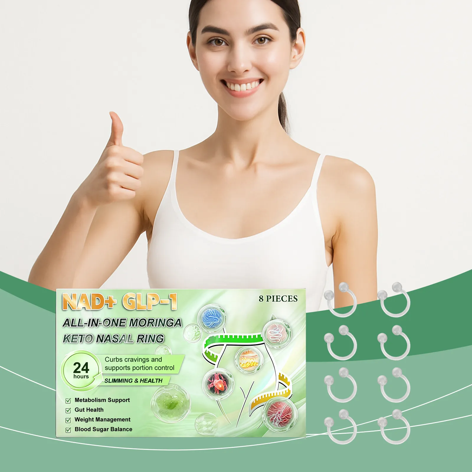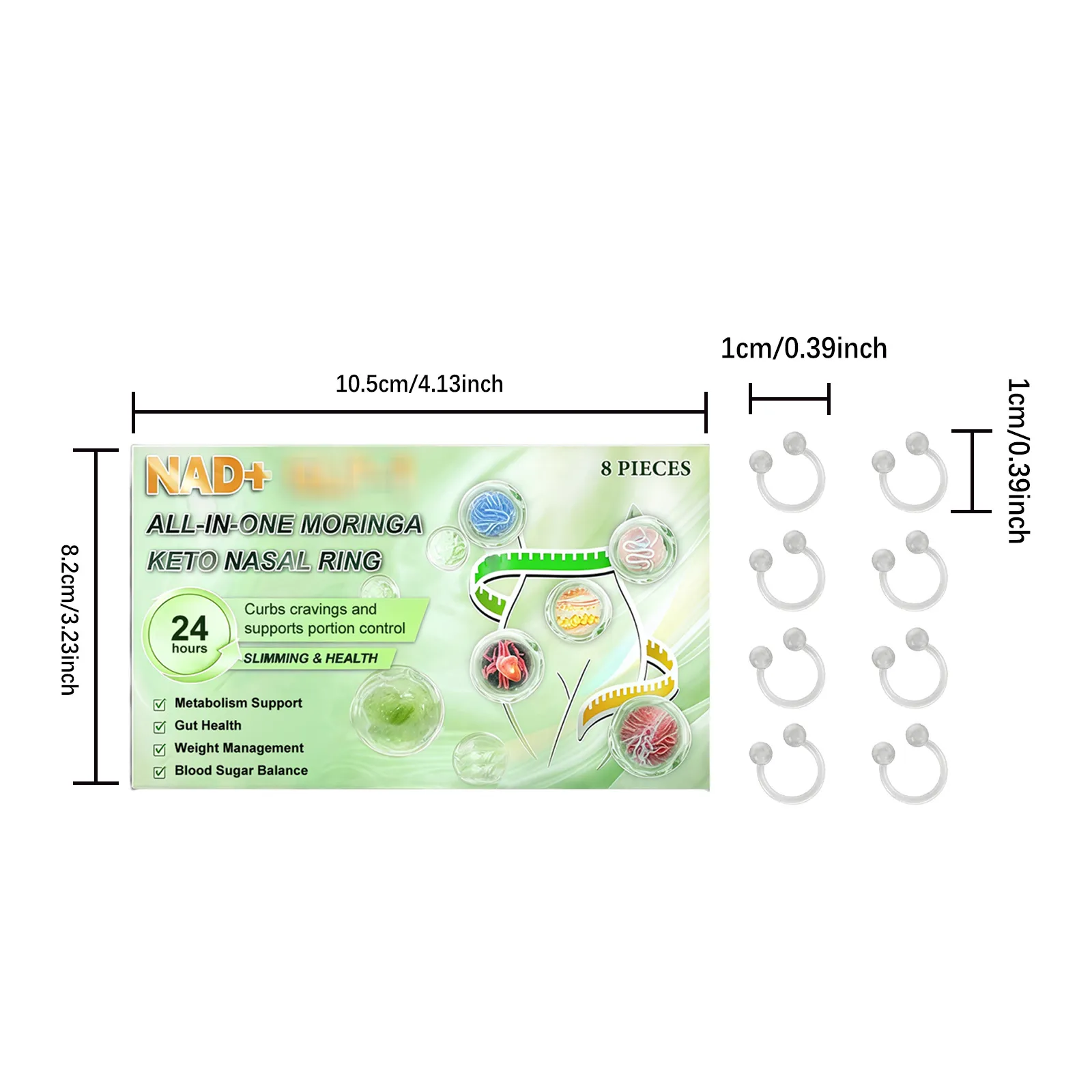 The NAD+ All-In-One Moringa Keto Nasal Ring is a breakthrough product that helps control cravings, support weight loss, and improve overall health. With natural Moringa and other beneficial ingredients, it helps regulate metabolism, balance blood sugar, and enhance gut health. This convenient and effective solution is ideal for anyone looking to take control of their health and wellness, offering 24-hour support to help you stay on track.