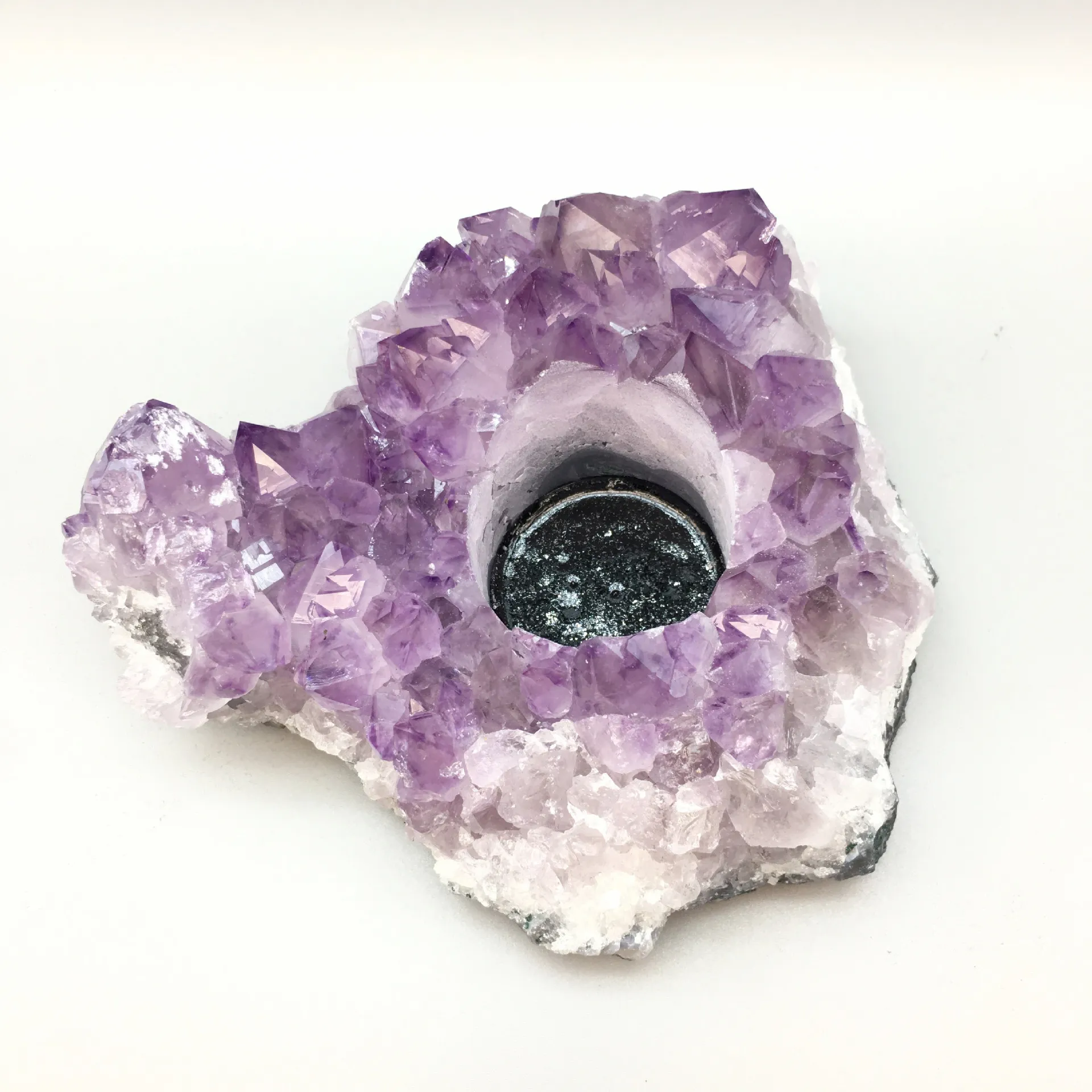 The Natural Amethyst Vug Candlestick Decoration is designed to hold a standard-sized candle. It can accommodate most small pillar candles, tea lights, or tapered candles.