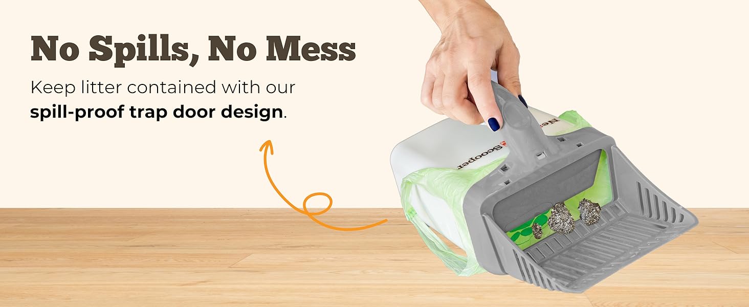 Between scoops, the trap door shuts to prevent spills. Works with all types of litter except pellets. Patented & patents pending. Bin