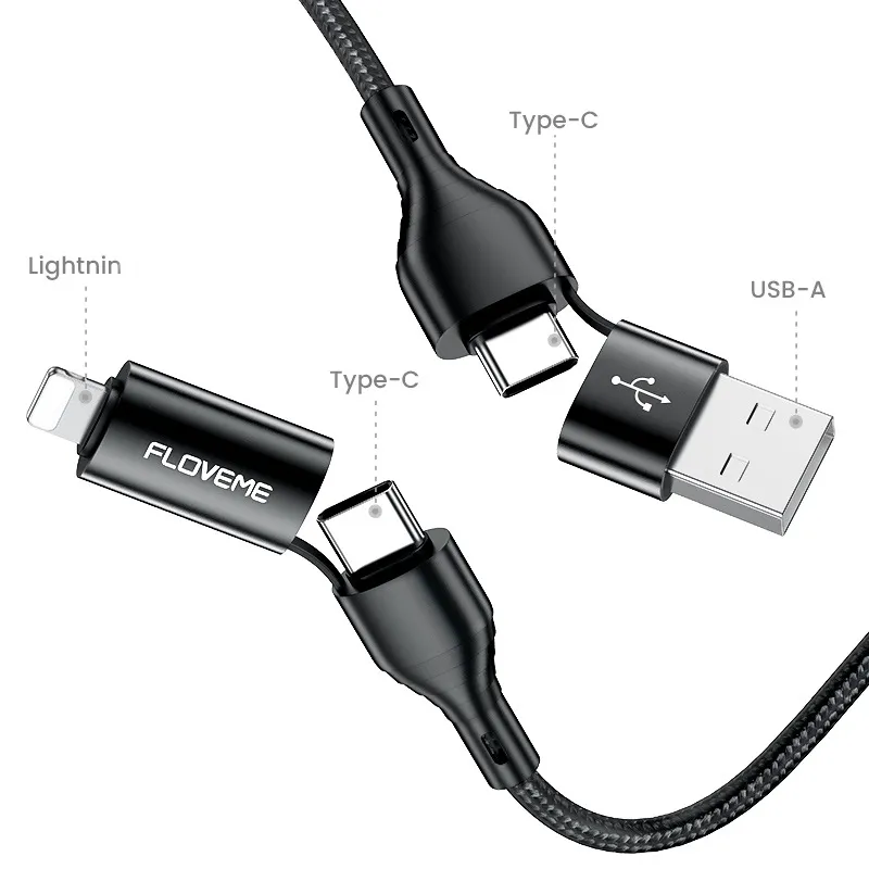 4-in-1 data cable, fast charging cable, Wish 3A charger, braided charging cord, universal USB cable, Type-C Lightning Micro USB cable,