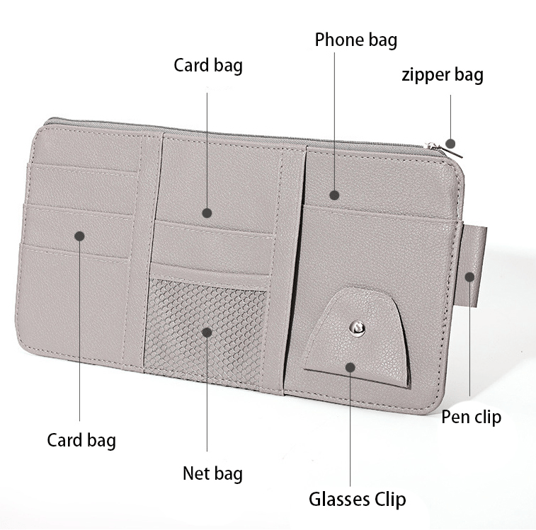 1 zipped big compartment, 1 mesh deep slip pocket, 5 card holder pockets and 1 Glasses clip. Perfectly for storing your phone, sunglasses, wires, documents, cards, pens, charger cord, earphones, CD and more. it is a great storage to save space