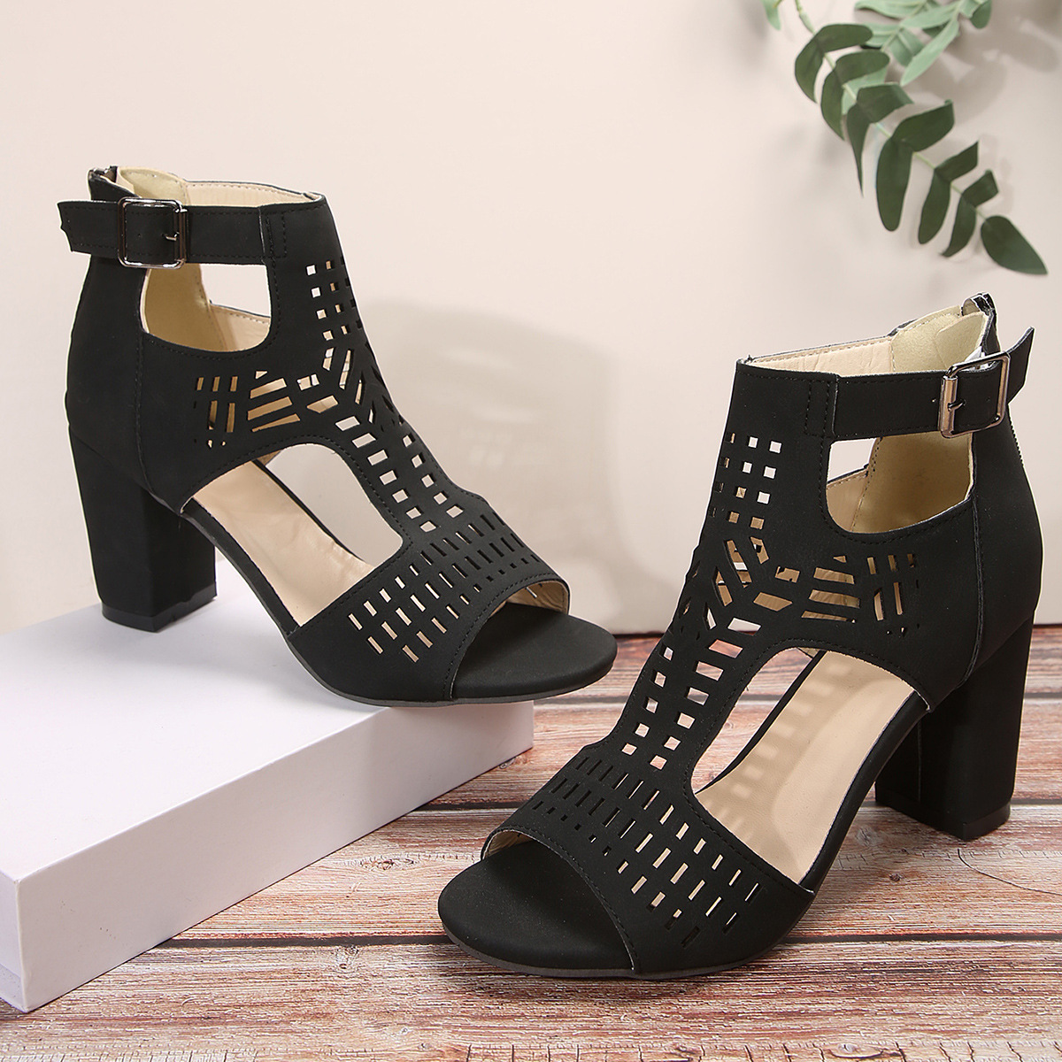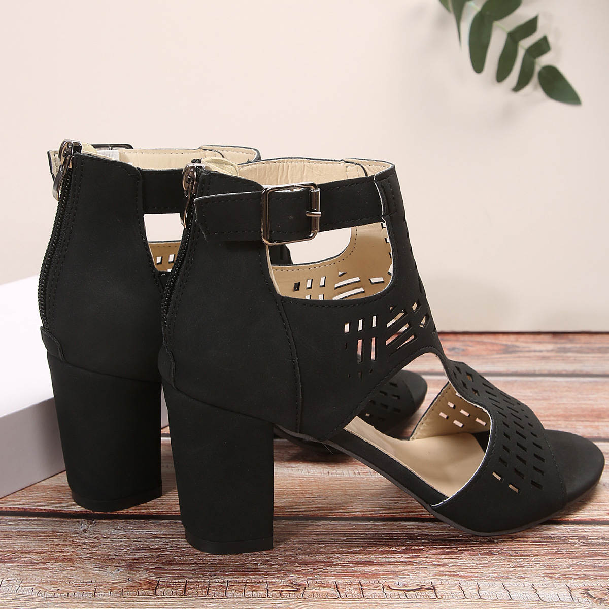 New High Square Heel Hollow Roman Shoes With Back Zipper For Women