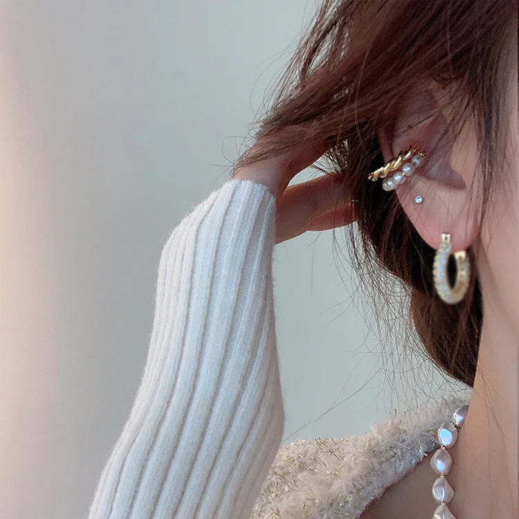 Elevate your accessory game with the New Korean Gold Color Double Circle Twist Pearl Ear Cuff, a perfect blend of vintage