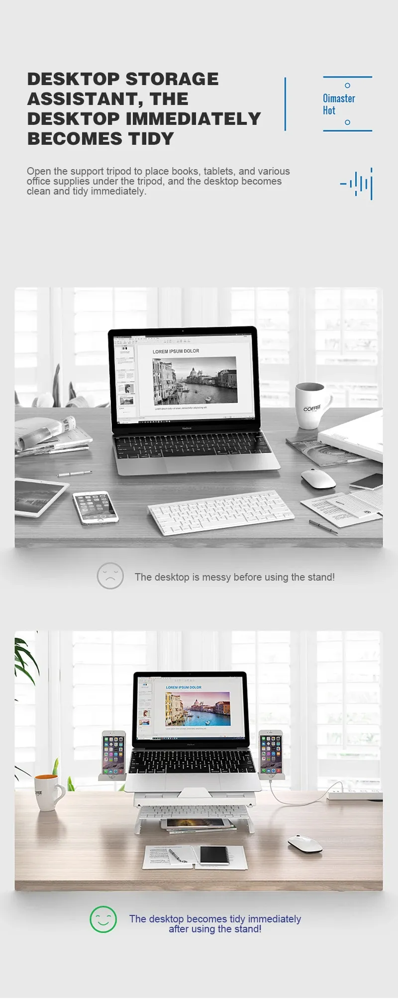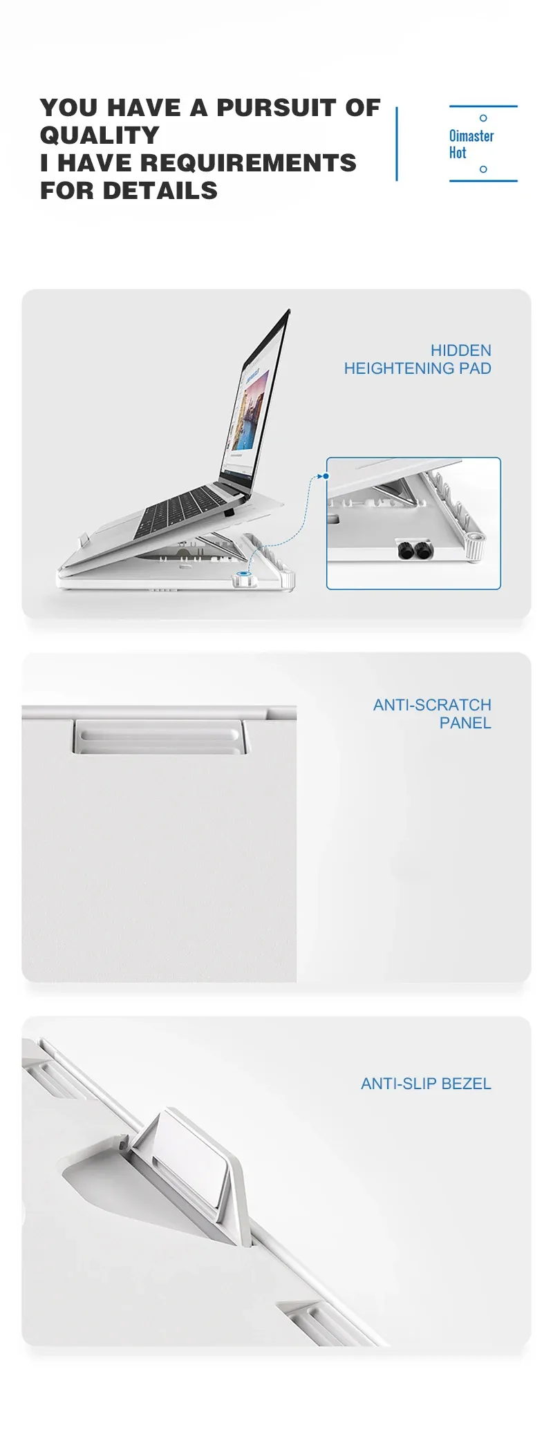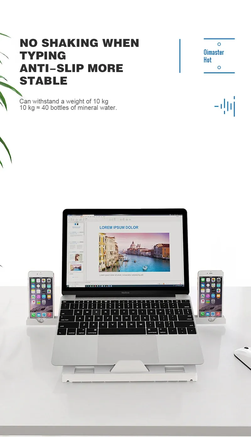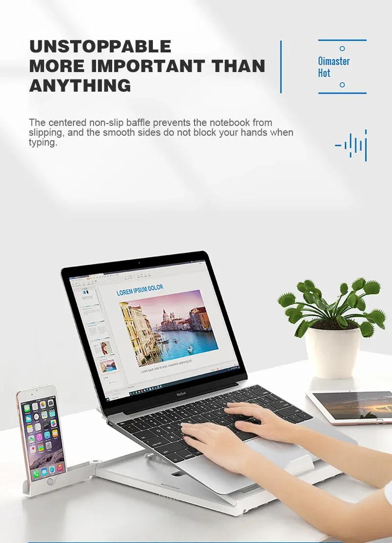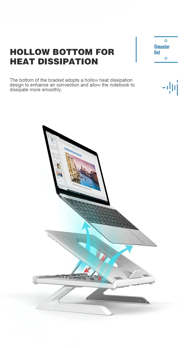 Laptop Riser with Heat-Vent: This Macbook stand has a big hole for ventilation, and is designed with a cooling slot, insert a cooling silicone pad into the corresponding cooling slot, adjust it to the appropriate position according to the needs of its own notebook and tablet. which is to cool down your laptop by providing more airflow than if it were lying flat on the table.