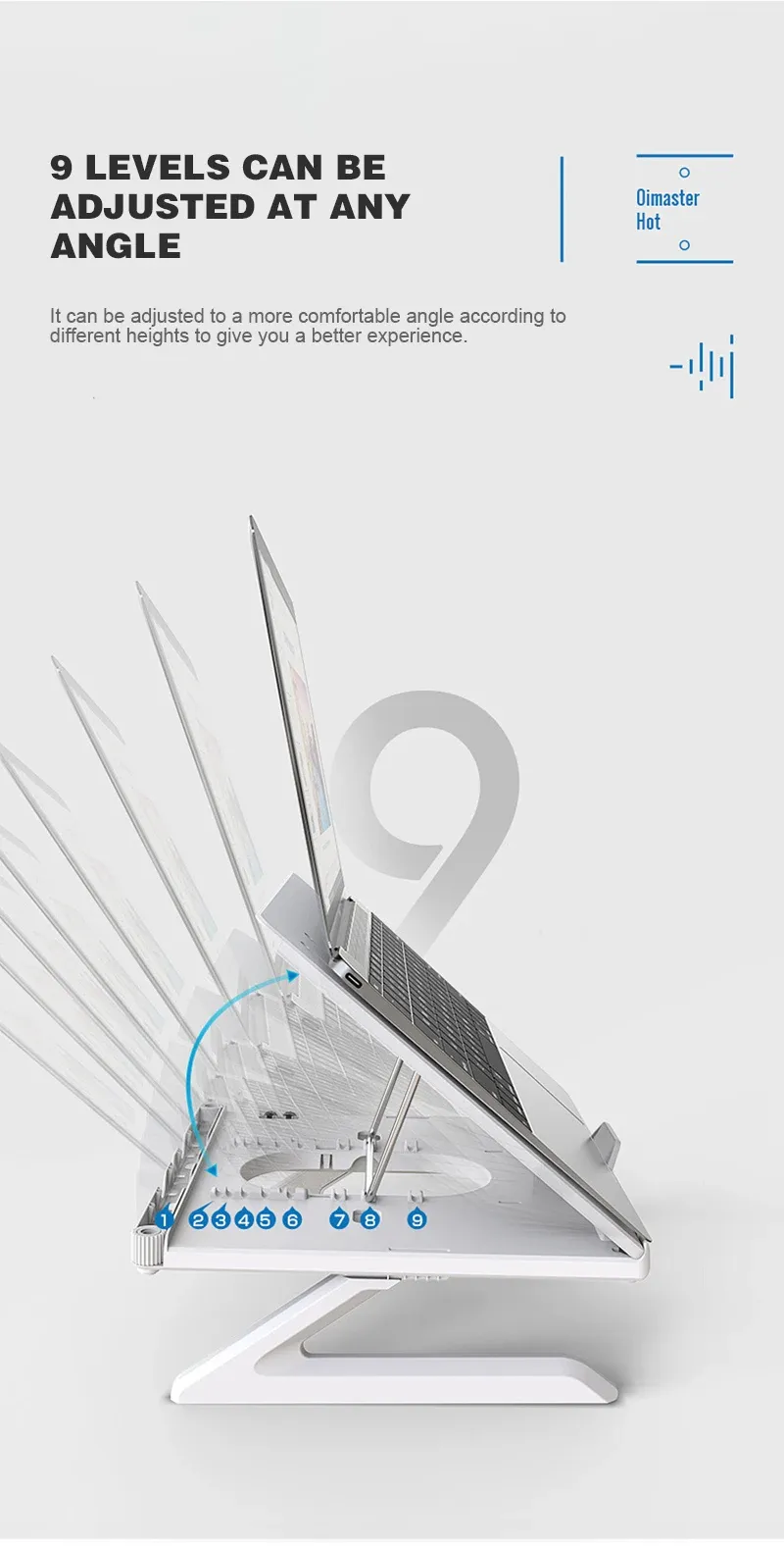 Adjustable Laptop Holder:9 levels of view angle adjustment, you can incline at different angles and stand it up higher or lower depending on your needs, The ergonomic laptop stand will help decrease the fatigue and soreness in your body after long hours of uncomfortable seating and hunching.