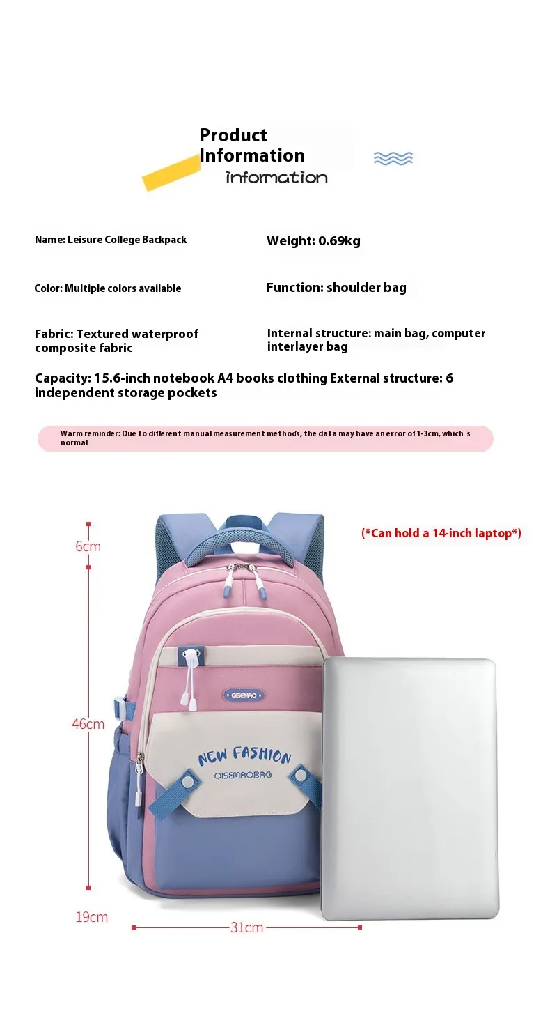 Product Name: New Student Colorful Contrast Color Schoolbag – Trendy and Functional Backpack for Students