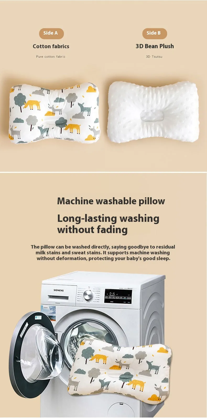 As any parent knows, baby products need to be practical and easy to clean. The Newborn Baby Soothing and Correcting Head Shape Shaping Pillow is machine washable, making it easy to keep clean and hygienic. Simply toss it in the washer for a quick refresh, ensuring that your baby always has a clean and comfortable pillow to rest on.