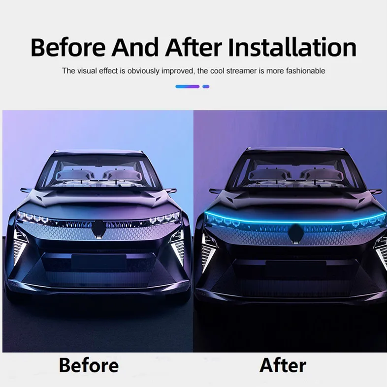 This LED car hood light offers a modern and eye-catching design that complements any car’s exterior. The dynamic daytime running lights provide enhanced visibility during daylight hours, while the turn signal feature creates an animated scanning effect that improves signaling clarity. The ambient lighting adds a sophisticated touch, giving your car a premium and futuristic look.