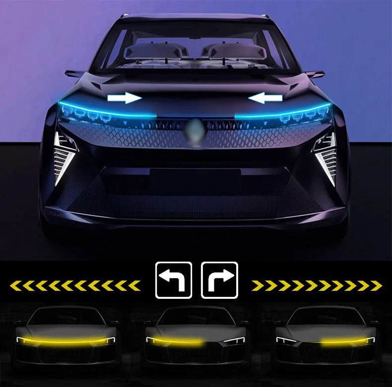 Transform your vehicle with the Newest LED Car Hood Light with Turn Signal, a cutting-edge decorative lighting solution that adds style, visibility, and functionality to your car. Featuring dynamic daytime running lights (DRL), a turn signal scanning effect, and ambient lighting, this 12V auto accessory combines aesthetics and safety in one sleek package. Perfect for car enthusiasts who want to enhance their vehicle's look while improving on-road visibility.
