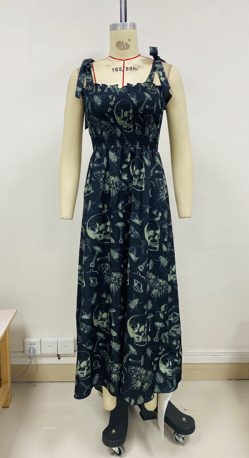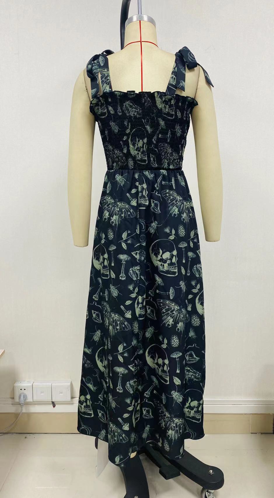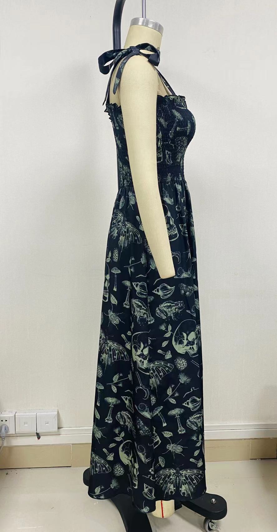 The dress features an enchanting dark print that whispers tales of midnight rendezvous and sophisticated soirées. Each pattern is meticulously designed to evoke an air of mystery and intrigue, ensuring that you'll leave a lasting impression wherever you go. The smocking detail on the bodice is not just a testament to expert craftsmanship but also a celebration of your unique shape, as it enhances your curves with precision and style.