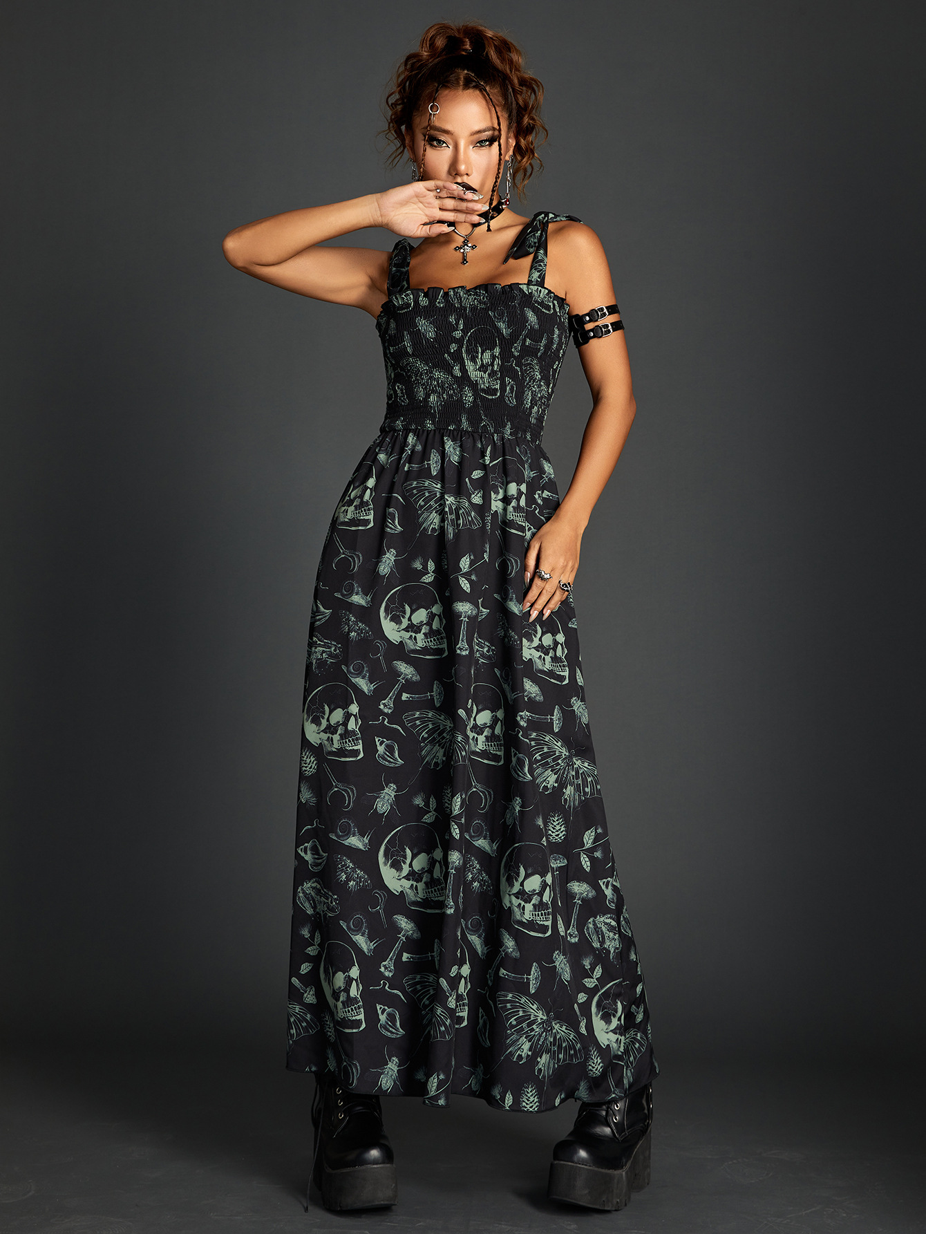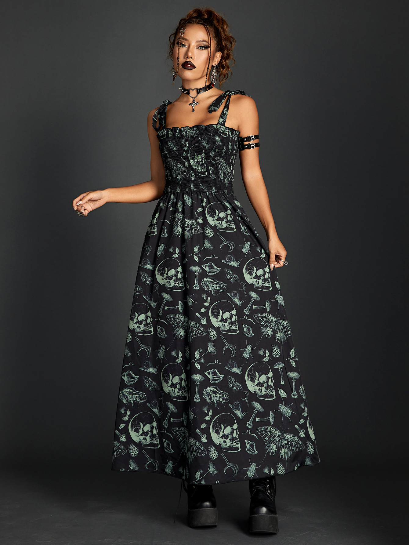 The tube top design of the dress is both daring and delightful, providing a modern silhouette that celebrates the shoulders and neckline. It serves as the perfect stage for your choice of accessories, whether a delicate pendant or bold, statement earrings, each complementing the dress’s dark charm.
