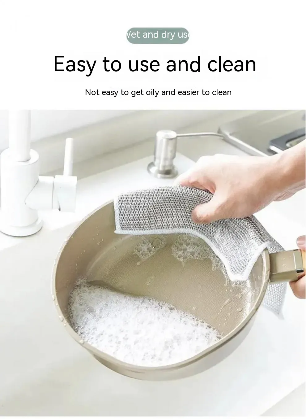 【Multi Purpose】The wire cleaning cloths are suitable for a variety of household cleaning tasks, such as kitchen, garage, shower room and other scenarios. Can be used wet or dry to easily scrub and clean dishes, sinks, counters, stove tops, pots, pans, ovens, grills and can even be used to scrub fruits, which makes it a must-have cleaning gadget for kitchens.