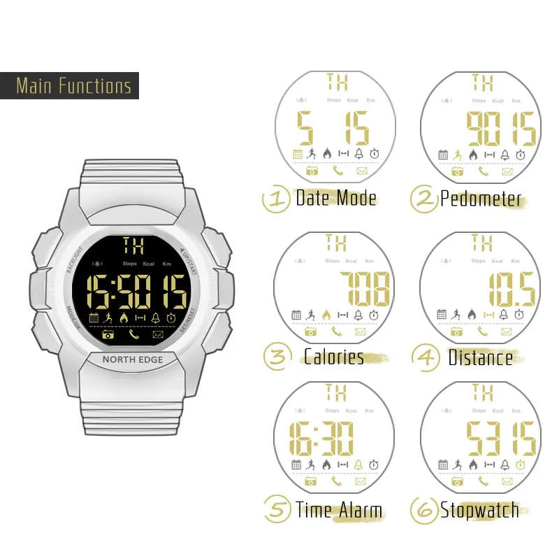 1. Date mode/2. Pedometer/3. Calories/4. Distance/5. Time Alarm/6. Stopwatch