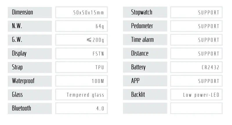 - Functions: Stopwatch, alarm, timekeeping, notifications (with compatible devices)