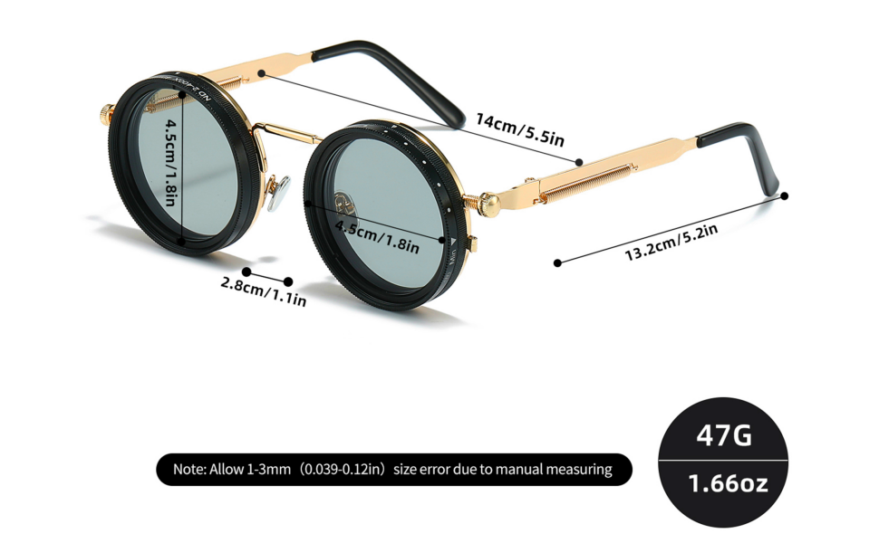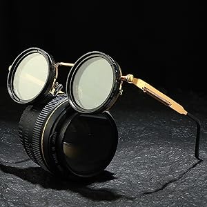 - 1. Steampunk Adaptive Shade System Gear-operated tint control (1-9 settings) with brass knurled dials adjusts from light amber to near-black. Industrial-grade polarized lenses block 100% UVA/B/C + HEV, featuring exposed "pressure gauge" style intensity indicators.