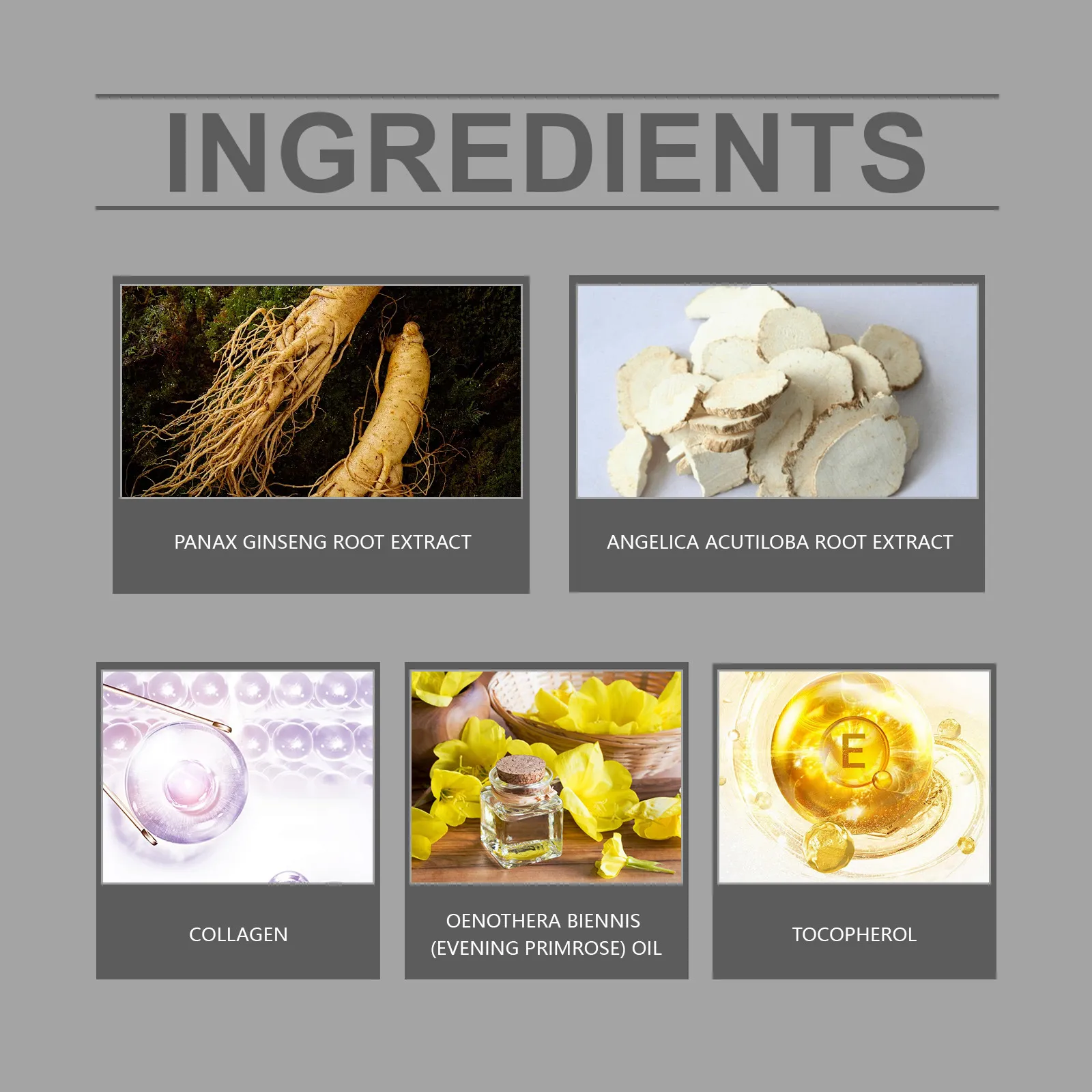 Ingredients: collagen, extractive of ginseng's root, angelica root extract, tocopherol (vitamin E), evening primrose seed oil