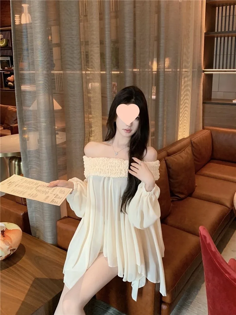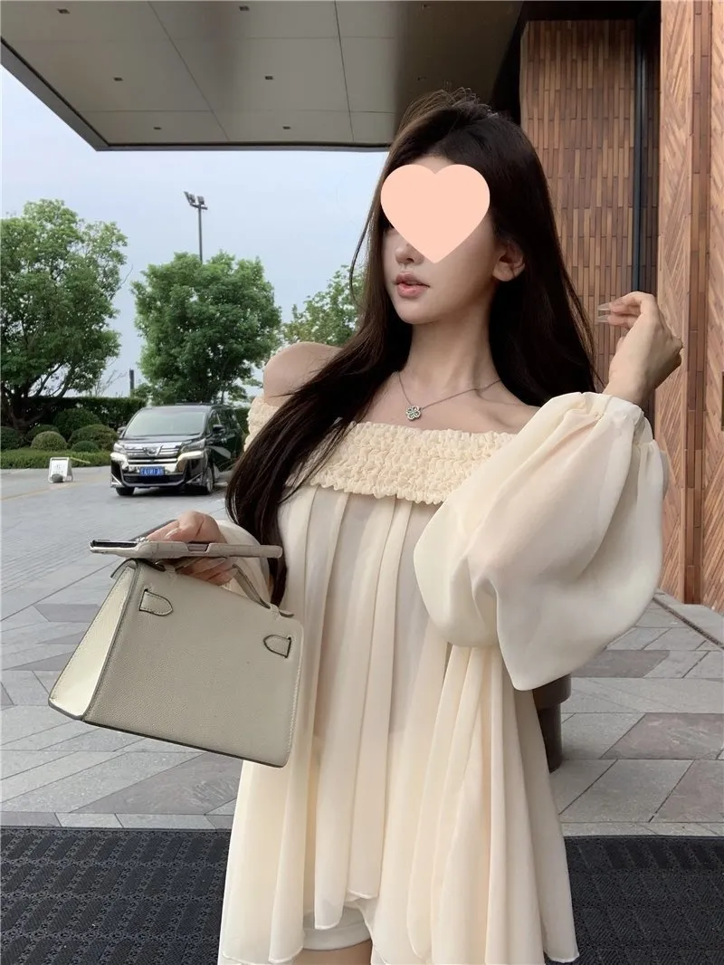 Off-shoulder Long Sleeve Chiffon Shirt Loose Mid-length Thin Top