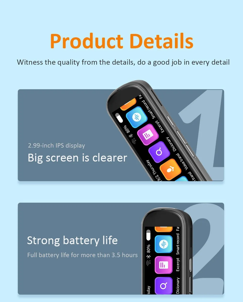 The pen can read the translated text out loud, helping with pronunciation and understanding. This feature is invaluable for learners and travelers who need to improve their listening skills or pronunciation.
