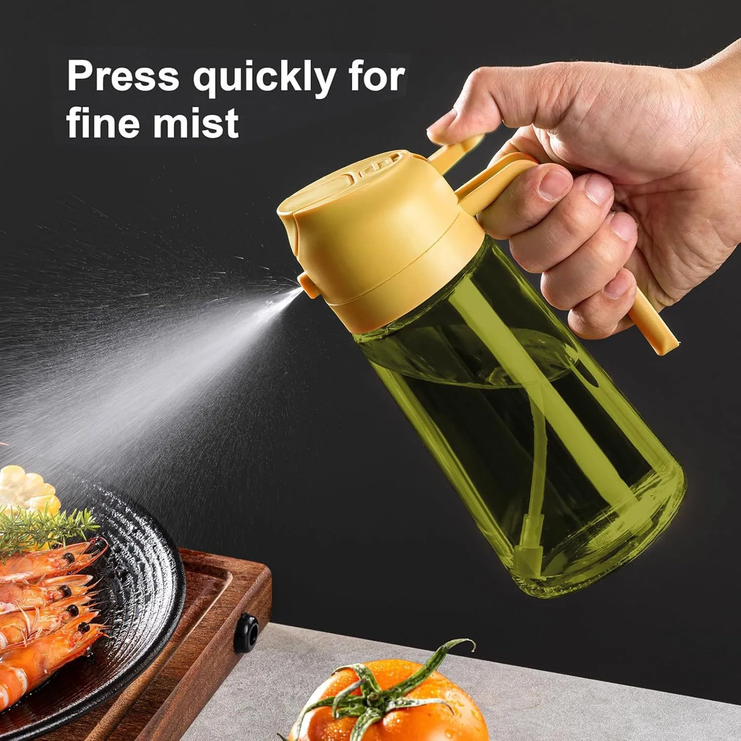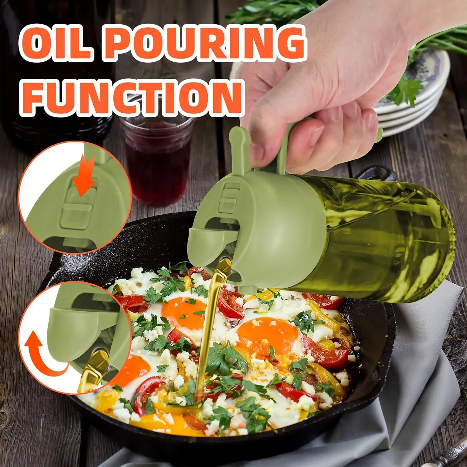 Use the dispenser to drizzle oil precisely over salads, pans, or dishes during cooking, controlling the amount with the pourer.