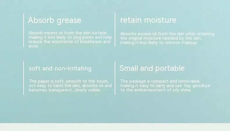 Oil removing sheets are an essential beauty tool for anyone dealing with oily skin. These thin, portable sheets are designed to absorb excess oil and shine, leaving your skin feeling fresh and matte without disrupting your makeup. Whether you're at work, in the gym, or simply on the go, oil removing sheets provide a quick and convenient solution to manage oily skin and maintain a flawless look throughout the day. In this product description, we’ll explore the key features, benefits, and reasons why oil removing sheets are a must-have in your skincare routine.