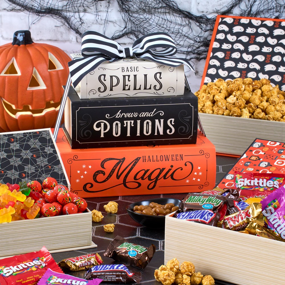 Embrace the spooky spirit of Halloween with our Open if You Dare Tower, an exciting gift packed with a selection of delicious, festive treats. This themed tower is designed to thrill and delight, perfect for Halloween parties, trick-or-treat surprises, or as a special gift for those who love the spooky season. The tower is stacked with multiple levels, each containing a different variety of snacks and candies, including classic Halloween flavors, spooky gummies, and delicious chocolates. Opening each layer reveals a new surprise, making it an interactive and fun experience for kids and adults alike.