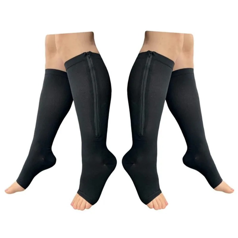 Open toe compression socks with zipper are specialized hosiery designed to improve circulation, reduce swelling, and provide support to your legs and feet, while featuring an open toe design for breathability and a convenient zipper for easy wearing and removal. Made from elastic, breathable materials, these socks apply graduated compression to enhance blood flow, making them ideal for those with varicose veins, edema, or those who spend long hours on their feet. The zipper adds practicality, helping users put on and take off the socks with minimal effort, especially beneficial for people with limited mobility.