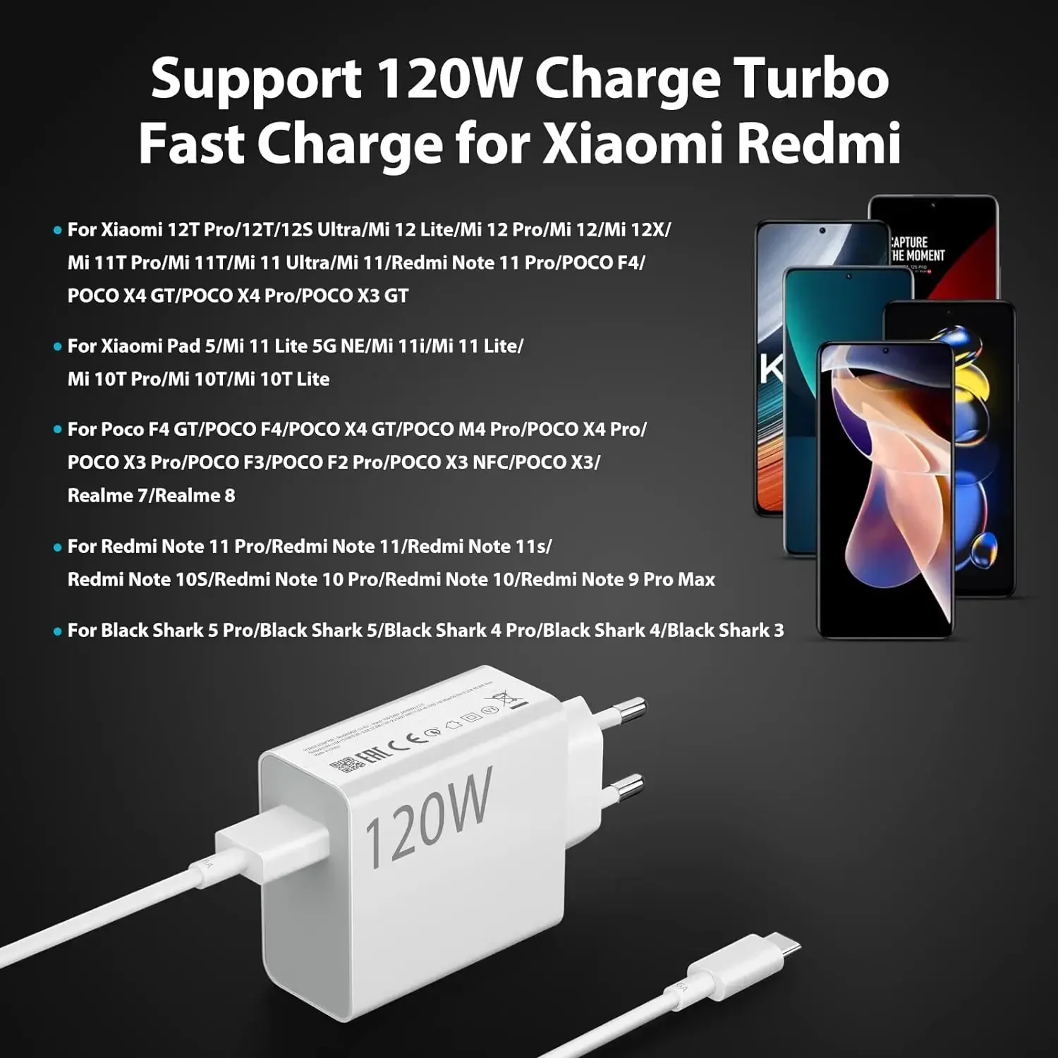 This original 120W ultra fast charger is designed for Xiaomi 14, 13, 12, 11, Redmi Note 11T, 12T, 13 Pro, and POCO X4, X5. It includes a 6A Type-C USB turbo charging cable, ensuring rapid and efficient charging for your devices, delivering powerful performance and reliability.Product sellpoints
