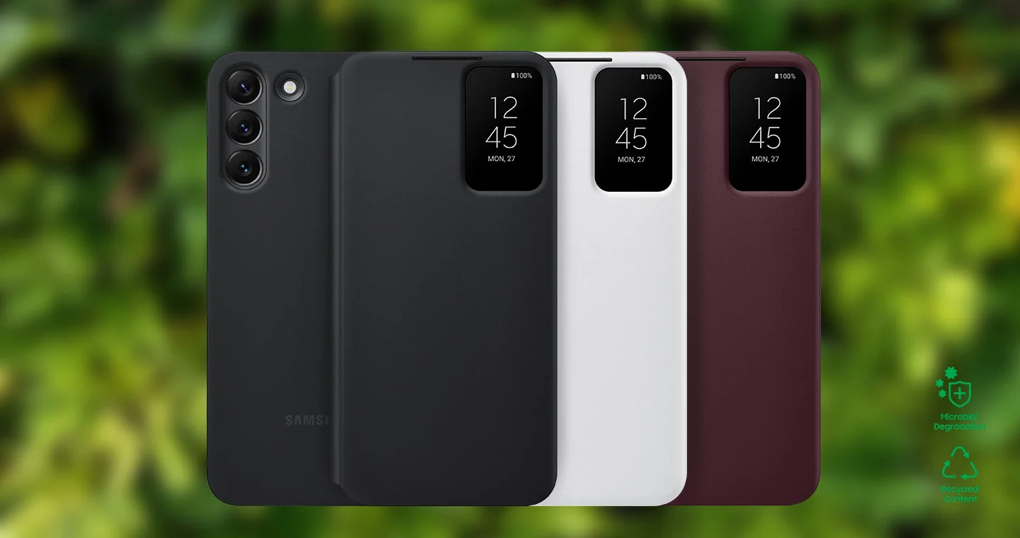 Treated with an antimicrobial coating, the S-View Flip Cover has protection against microbial growth to help keep your case clean. *The outside of Galaxy S22+ S-View Flip Cover meets the requirements of antimicrobial activity as set by the FITI Testing & Research Institute. *To perform its antimicrobial function, this product has been treated with the biocidal substance Zinc Pyrithione. *Antimicrobial property does not completely protect users against bacteria and provides no protection against viruses including Covid-19. *Antimicrobial effect may vary depending on conditions of use. *Antimicrobial coating on outside of phone case only.
