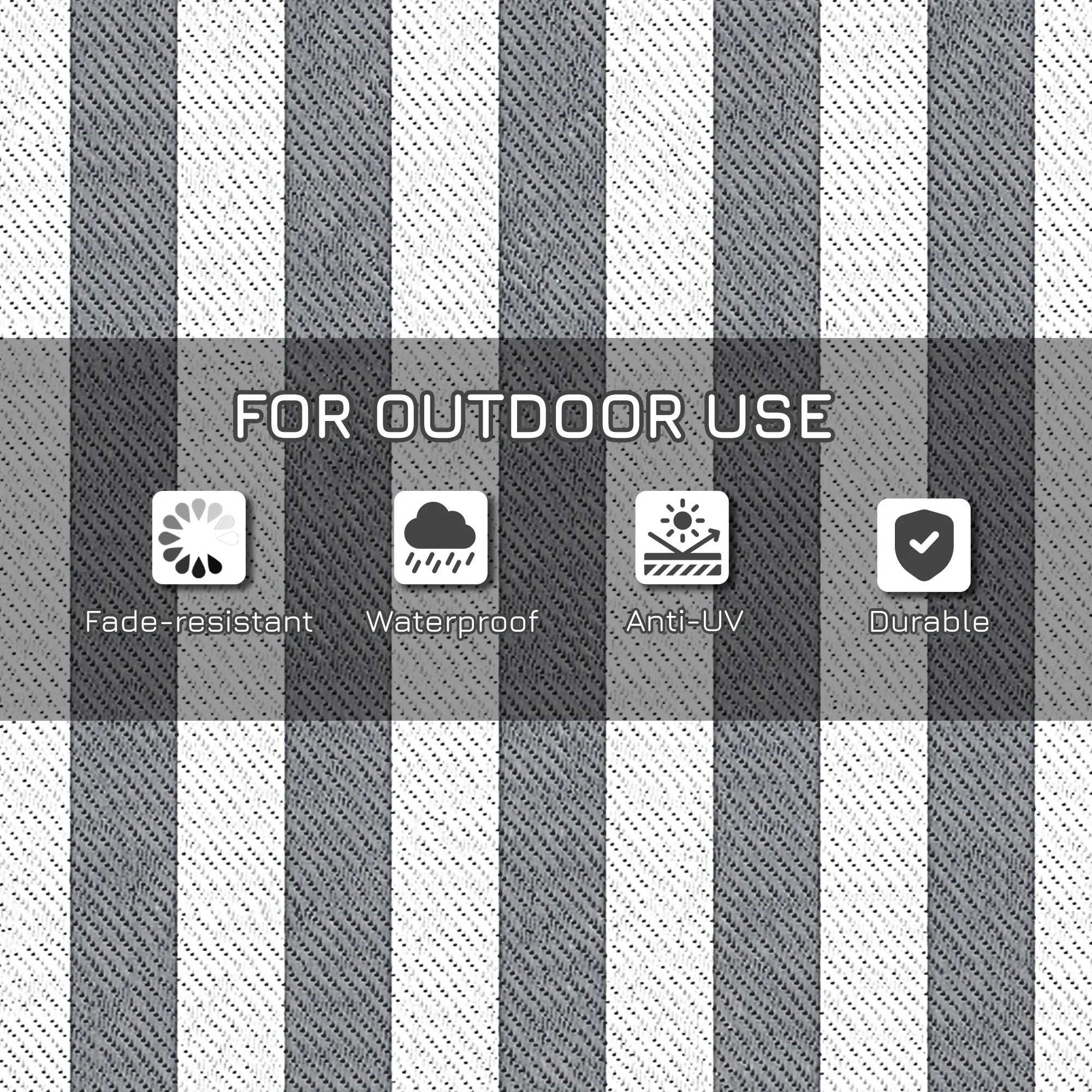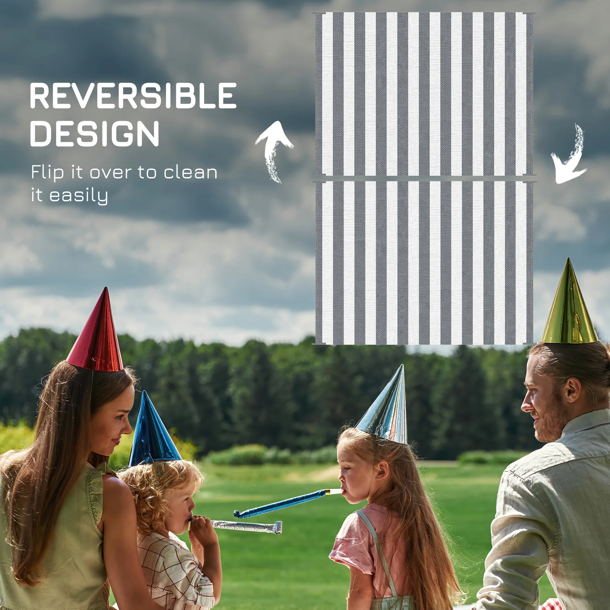 Camp on carpet with Outsunny. This waterproof rug is designed to handle dirt. Outdoor-ready, our rug really cleans up fast; sweep it, spray it, wipe it, or wave it; its powerful polypropylene fibers stay dry and don't saturate. Keep an outdoor rug in the camper, RV, or car; it's excellent for camping, beach trips, patio picnics, or anywhere outside. The color is reversible, meaning you can flip our plastic rug over to have a fresh side or a fresh style. Upholster the outdoors with Outsunny. Features: - Waterproof rug for camping, picnics, or the RV - Foldable design for space-saving storage and transport - Reversible design with two usable sides - Reinforced edges to prevent fraying - Mount it to the ground from the four corner loops Specification: - Style: Gray, White - Materials: 310g/m² Polypropylene, Non-Woven Fabric - Overall Dimensions: 107.75" W x 143.75" L - Carry Bag Dimensions: 28" L x 12.5" W x 7.5" H - Item Label: 844-634V00GY - NOTE: This outside rug is not fireproof. Please keep it away from fire, ashes, and embers Package Includes: - 1 x Outdoor Rug - 1 x Carry Bag Camp on a carpet with Outsunny. This porch rug is designed to handle dirt. Outdoor-ready, our rug really cleans up fast; sweep, spray, wipe, or wave it; its powerful polypropylene fibers stay dry and don't saturate. The color is reversible, meaning you can flip our plastic rug over for a fresh side or style. Features: - Reversible with double sides for varied use - Made of polypropylene, with a protective coating to help prevent fading and sun damage - Features robust edging to prevent fraying - Space-saving foldable design for easy storage and transport - Carry bag included - Versatile for camping, picnics, RV road tours, and more Specification: - Color: Black and White - Style: Chain - Materials: 310g/m² Polypropylene, Non-Woven Fabric - Dimensions: 215.7" L x 107.9" W - Carry Bag Dimensions: 36.6" L x 13.4" W x 7.5" H - Item Label: 844-805V00MX - Note: Not fireproof, keep away from fire Package Includes: - 1 x Outdoor Rug - 1 x Carry Bag Camp on carpet with Outsunny. Features: - Waterproof rug for camping, picnics, or the RV - Foldable design for space-saving storage and transport - Reversible design with two usable sides - Reinforced edges to prevent fraying - Mount it to the ground from the four corner loops Specification: - Style: Black and White Chain - Materials: 310g/m² Polypropylene, Non-Woven Fabric - Overall Dimensions: 95.75" W x 120" L - Carry Bag Dimensions: 24.5" L x 12.5" W x 5.5" H - Item Label: 844-805V02MX - NOTE: This outside rug is not fireproof. Please keep it away from fire, ashes, and embers Package Includes: - 1 x Outdoor Rug - 1 x Carry Bag Camp on carpet with Outsunny. Features: - Waterproof rug for camping, picnics, or the RV - Foldable design for space-saving storage and transport - Reversible design with two usable sides - Reinforced edges to prevent fraying - Mount it to the ground from the four corner loops Specification: - Style: Black and White Chain - Materials: 310g/m² Polypropylene, Non-Woven Fabric - Overall Dimensions: 107.75" W x 143.75" L - Carry Bag Dimensions: 28" L x 12.5" W x 7.5" H - Item Label: 844-805V01MX - NOTE: This outside rug is not fireproof. Please keep it away from fire, ashes, and embers Package Includes: - 1 x Outdoor Rug - 1 x Carry Bag.