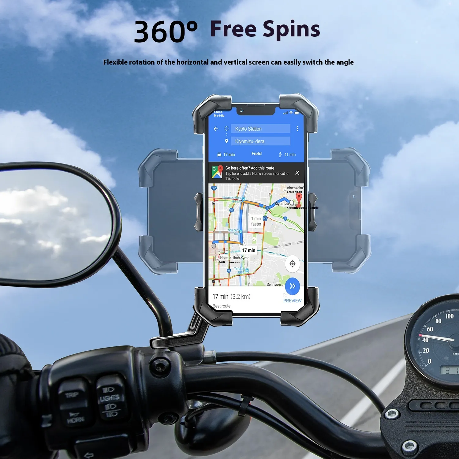 The flexible clamp design fits most smartphones (4.7–7.0 inches) and can be attached to bicycle handlebars, scooters, and even motorcycles. Easy to install without tools, it ensures quick setup for every ride.