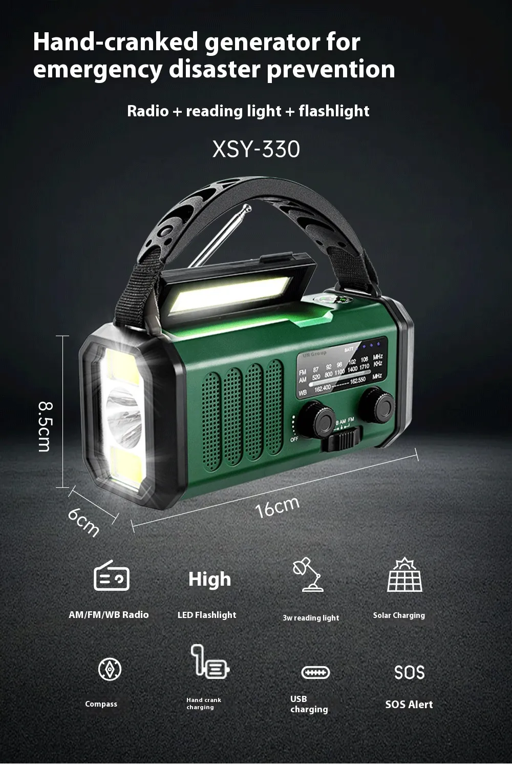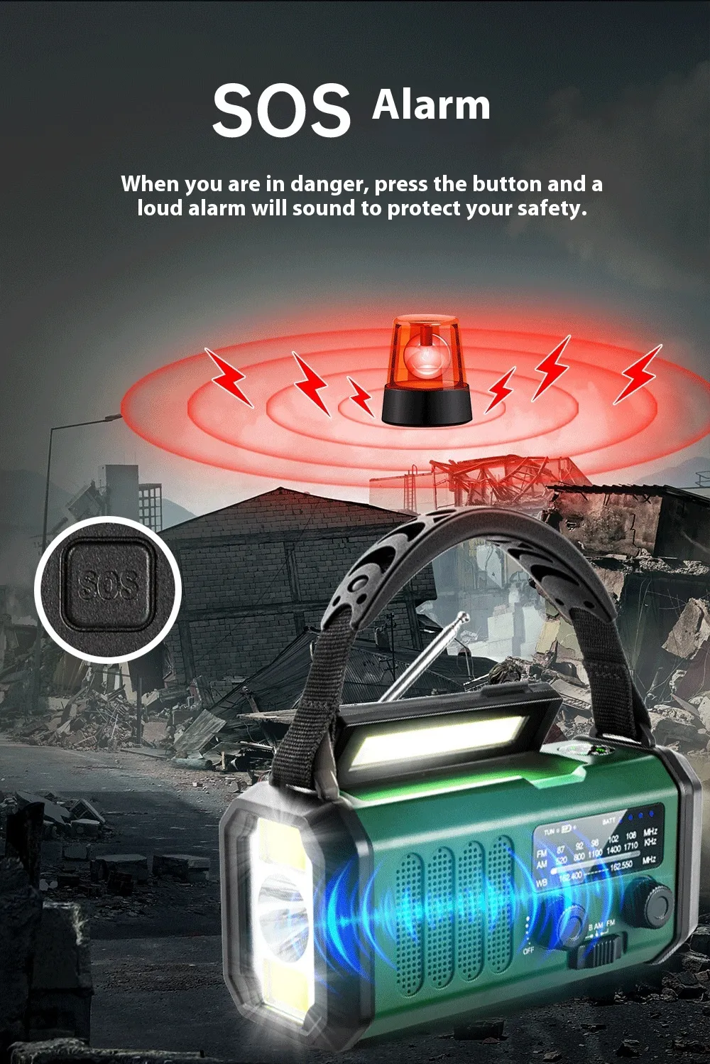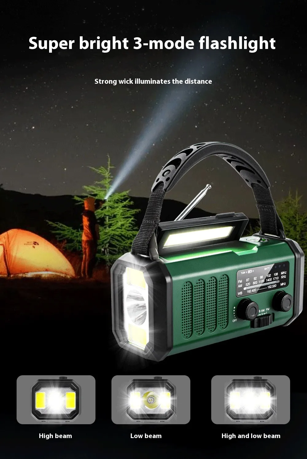 - Camping: Stay safe with reliable light and stay connected to weather updates and news through the FM/AM radio.