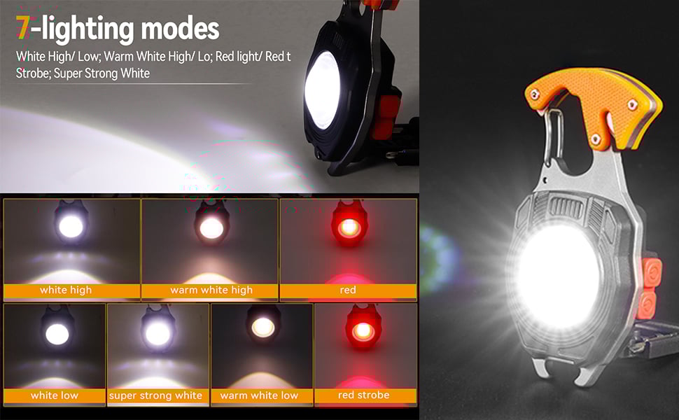 - 7 Lighting Modes: This COB light has 7 lighting modes: white light, white low light, white intense light, warm light, warm low light, red light and red flashing light. This keychain light can emit up to 1000 lumen light and offers a wider range of bright light, sufficient to illuminate your path.