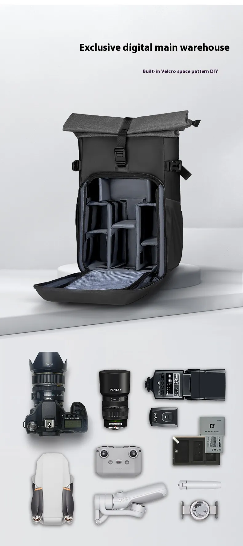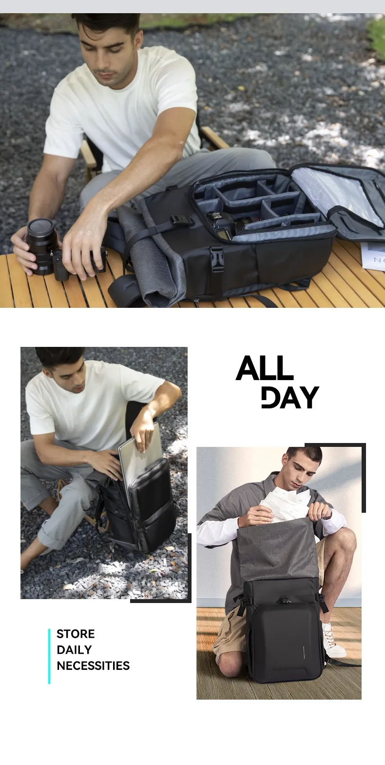 dusty environments.The Multifunctional Backpack features a spacious main compartment that can accommodate a camera, multiple lenses, a