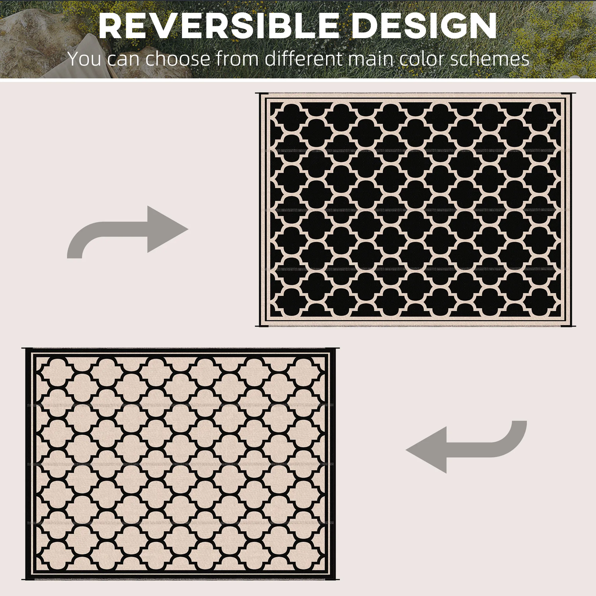 Crafted from high-quality, UV-resistant, and water-resistant materials, the outdoor rug is designed to withstand outdoor conditions, ensuring long-lasting use without fading or deteriorating.