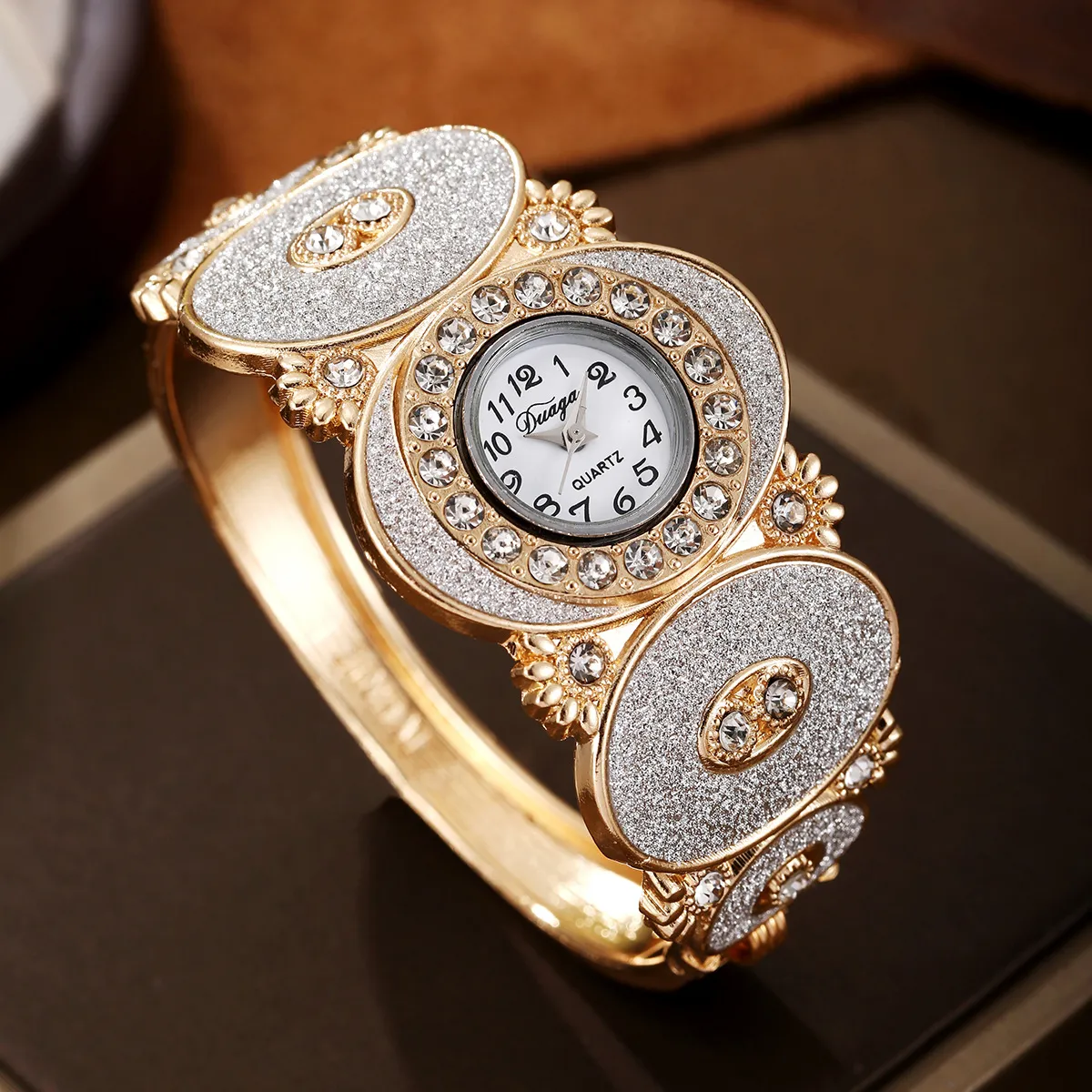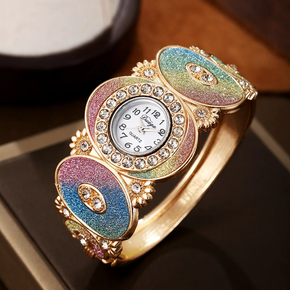 This luxury bangle watch is perfect for women who want to make a bold fashion statement while keeping track of time. The oval diamond decoration, paired with the flower and leaf design, offers a unique, feminine aesthetic that adds elegance to any outfit. Whether you’re attending an important event or adding a touch of sophistication to your everyday look, this watch combines functionality and luxury in one exquisite piece.